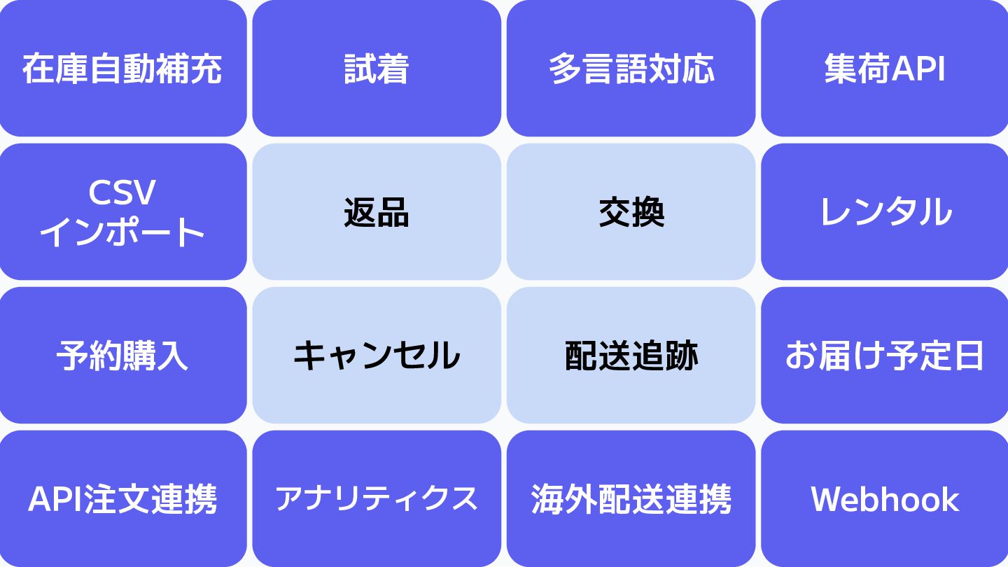 43 返品 交換 キャンセル 配送追跡 アナリティクス 海外配送連携 試着 多言語対応 CSV