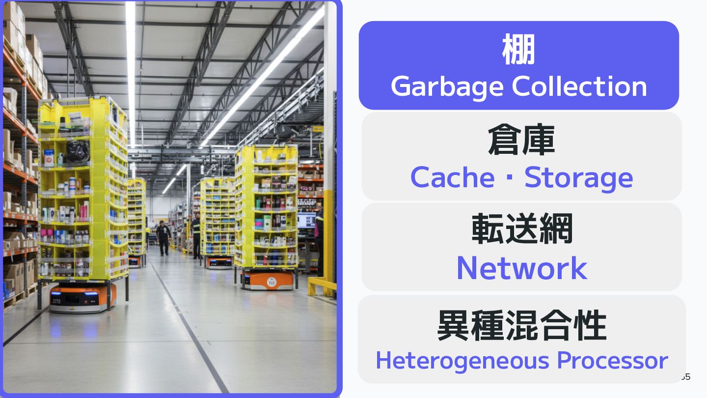 55 棚 Garbage Collection 異種混合性 Heterogeneous Processor 倉庫 Cache・Storage 転送網