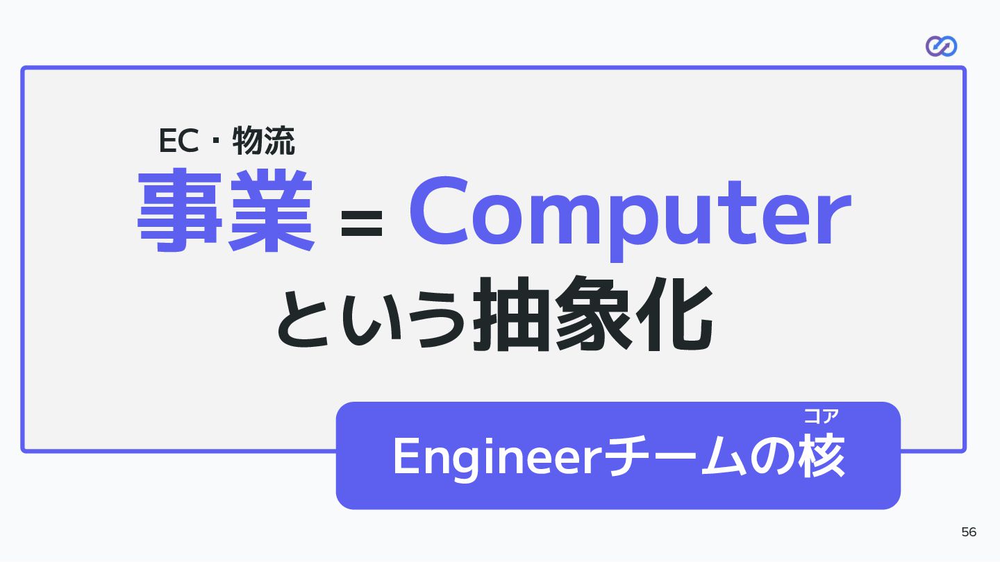 56 事業 = Computer という抽象化 Engineerチームの核 EC・物流 コア