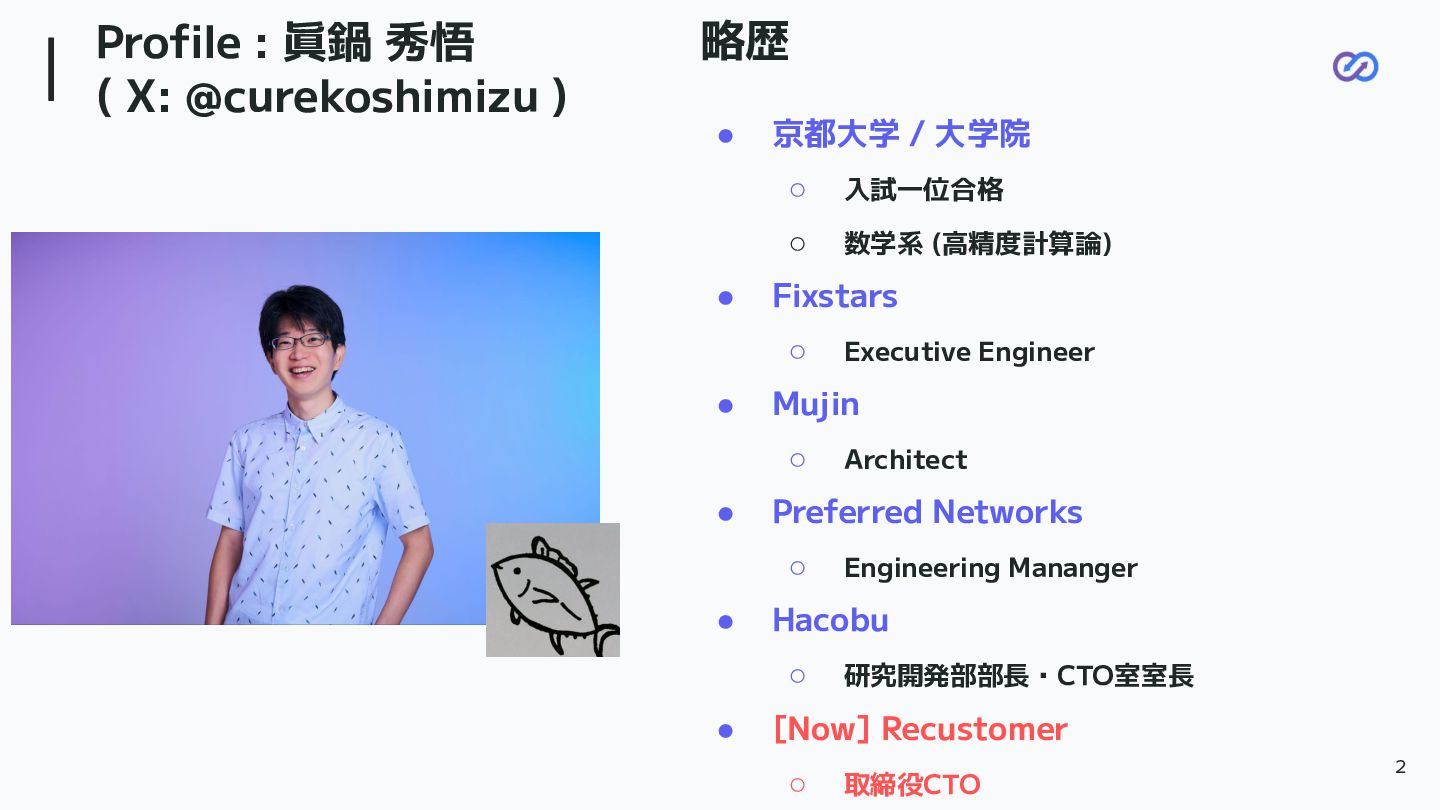 京都大学 / 大学院 ◦ 入試一位合格 ◦ 数学系 (高精度計算論) • Fixstars ◦ Executive Engineer • Mujin ◦ Architect • Preferred Networks ◦ Engineering Mananger • Hacobu ◦ 研究開発部部長・CTO室室長 • [Now] Recustomer ◦ 取締役CTO 2