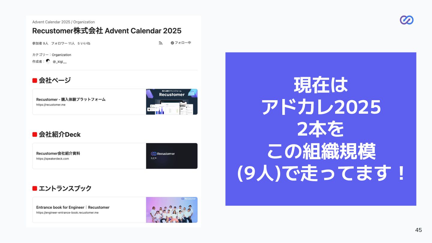 現在は アドカレ2025 2本を この組織規模 (9人)で走ってます! 45
