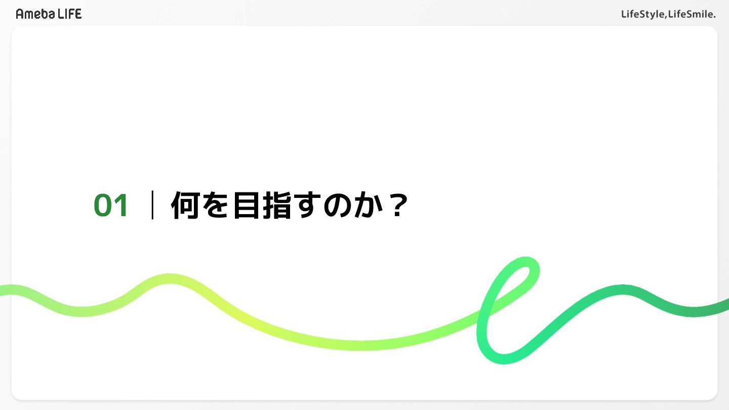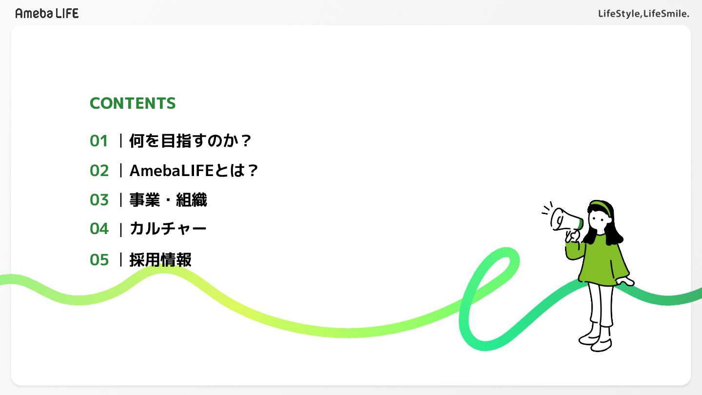 CONTENTS 何を目指すのか? 01 AmebaLIFEとは? 02 事業・組織 03 カルチャー 04 採用情報