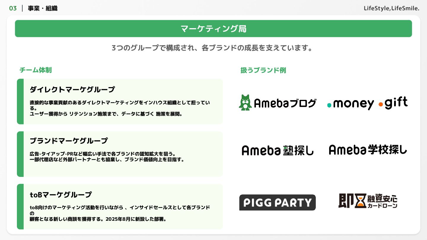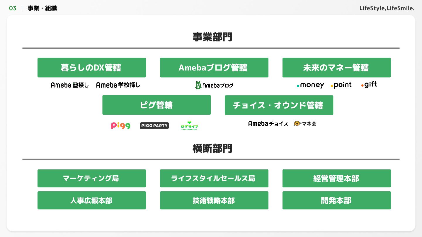 事業・組織 03 暮らしのDX管轄 Amebaブログ管轄 未来のマネー管轄 ピグ管轄 チョイス・オウンド管轄 マーケティング局 ライフスタイルセールス局 経営管理本部