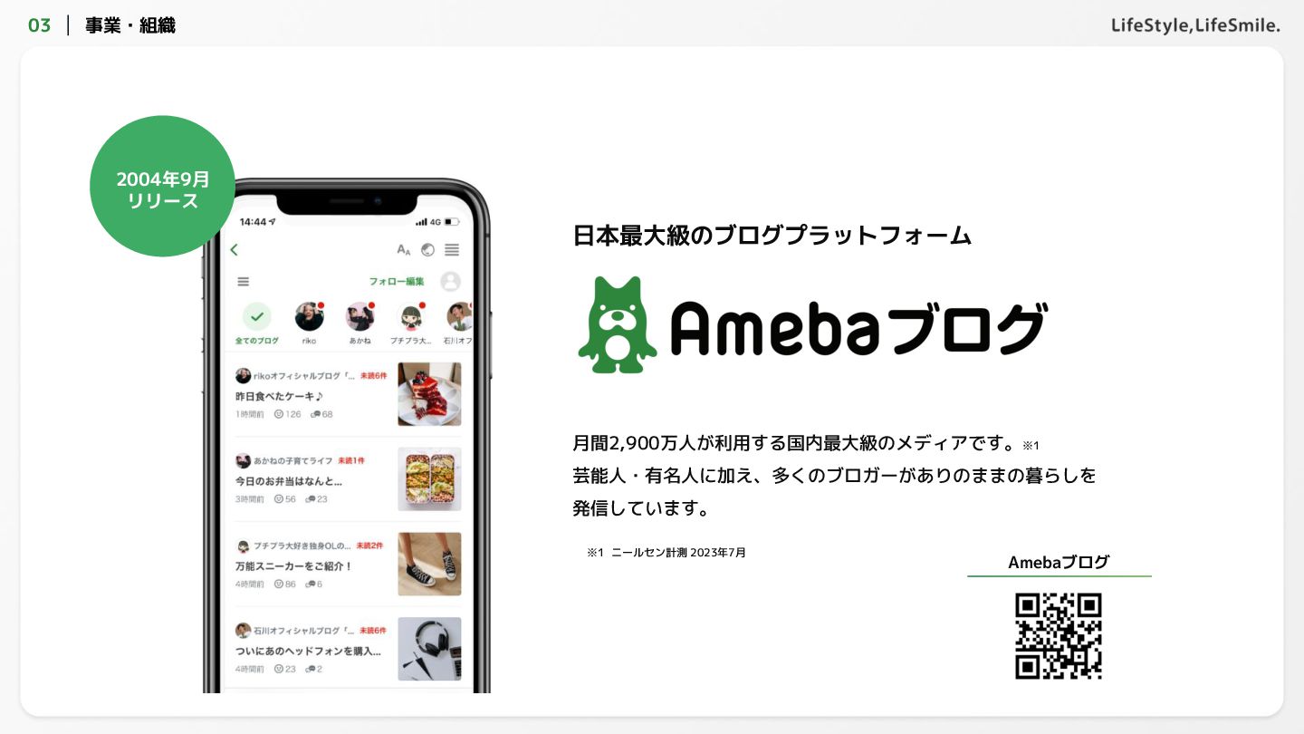 事業・組織 03 2004年9月 リリース Amebaブログ 月間2,900万人が利用する国内最大級のメディアです。※1 芸能人・有名人に加え、多くのブロガーがありのままの暮らしを 発信しています。 日本最大級のブログプラットフォーム ※1