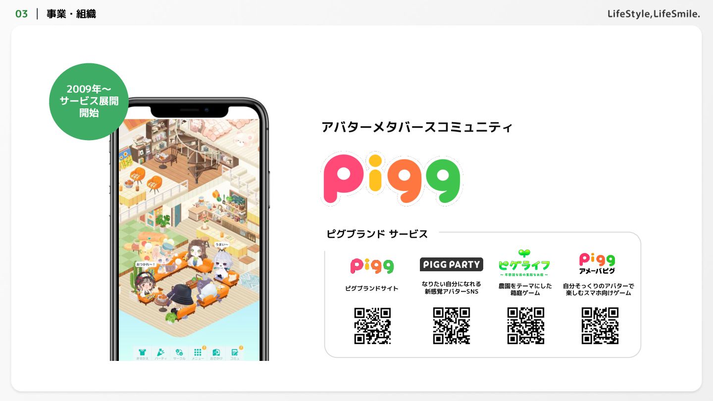 事業・組織 03 ピグブランド サービス アバターメタバースコミュニティ 農園をテーマにした 箱庭ゲーム なりたい自分になれる 新感覚アバターSNS 自分そっくりのアバターで