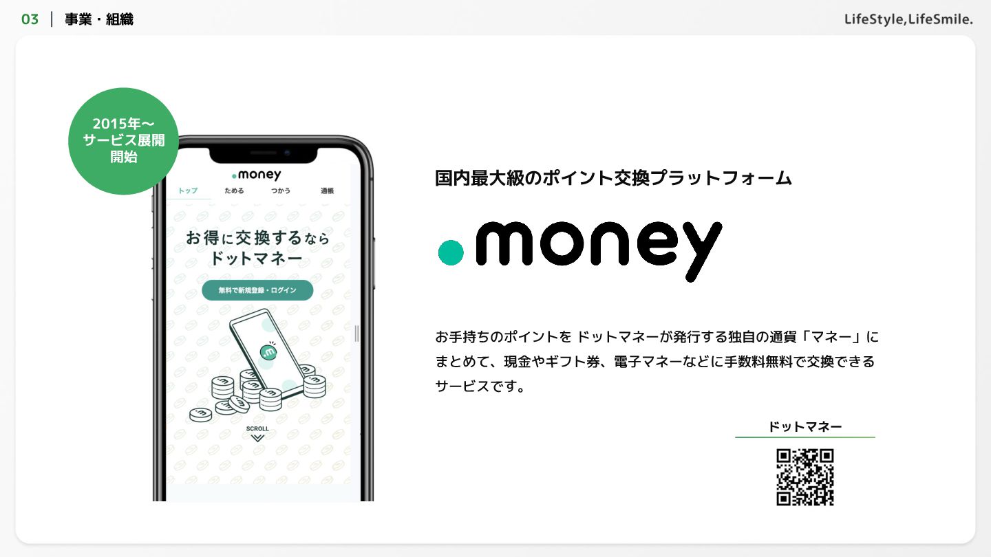 事業・組織 03 国内最大級のポイント交換プラットフォーム ドットマネー お手持ちのポイントを ドットマネーが発行する独自の通貨「マネー」に まとめて、現金やギフト券、電子マネーなどに手数料無料で交換できる サービスです。 2015年~ サービス展開