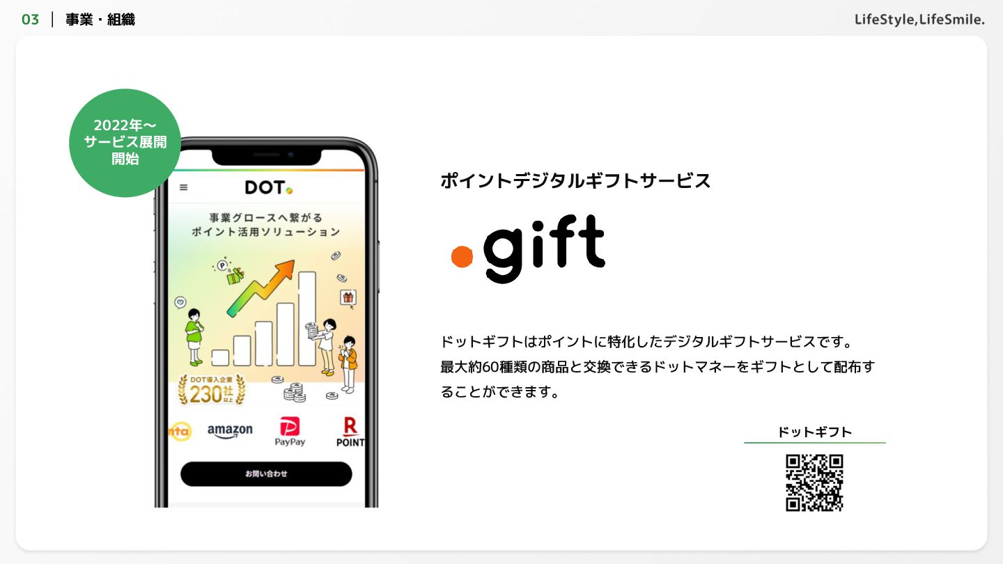 事業・組織 03 ポイントデジタルギフトサービス 2022年~ サービス展開 開始 ドットギフト ドットギフトはポイントに特化したデジタルギフトサービスです。 最大約60種類の商品と交換できるドットマネーをギフトとして配布す ることができます。