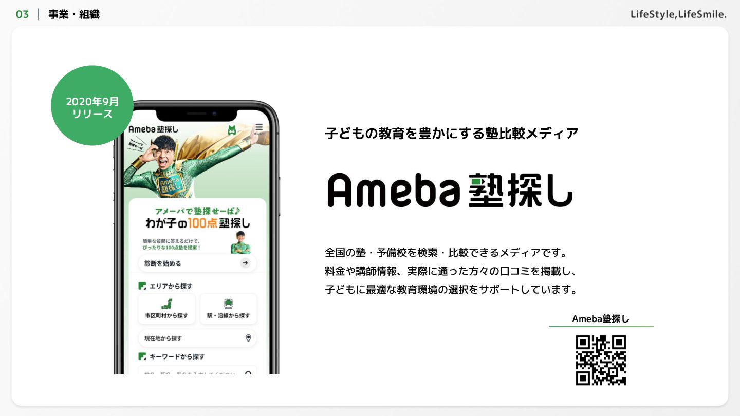 事業・組織 03 子どもの教育を豊かにする塾比較メディア 全国の塾・予備校を検索・比較できるメディアです。 料金や講師情報、実際に通った方々の口コミを掲載し、 子どもに最適な教育環境の選択をサポートしています。 Ameba塾探し 2020年9月 リリース