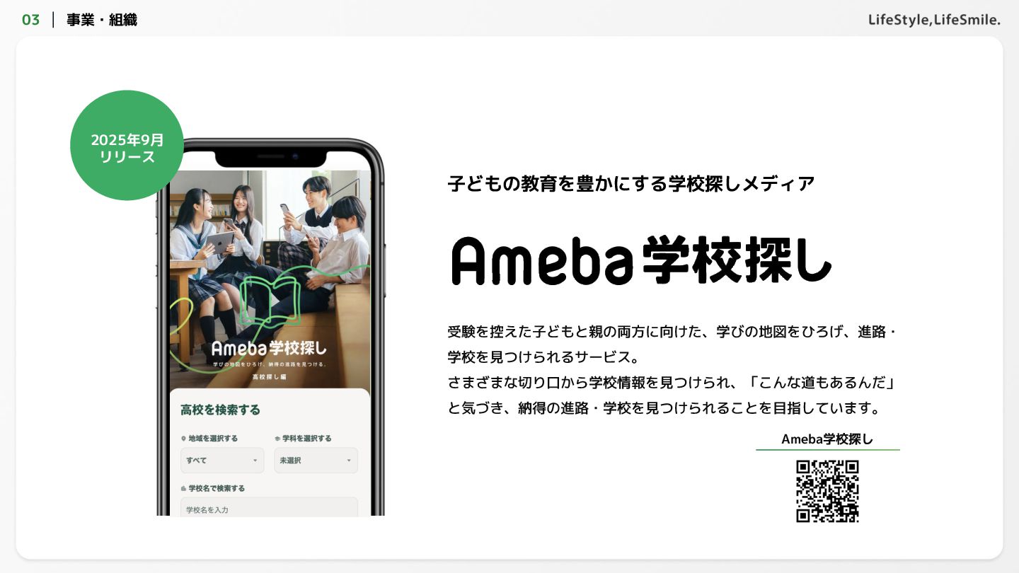 事業・組織 03 子どもの教育を豊かにする学校探しメディア 受験を控えた子どもと親の両方に向けた、学びの地図をひろげ、進路・ 学校を見つけられるサービス。 さまざまな切り口から学校情報を見つけられ、「こんな道もあるんだ」 と気づき、納得の進路・学校を見つけられることを目指しています。 Ameba学校探し 2025年9月 リリース