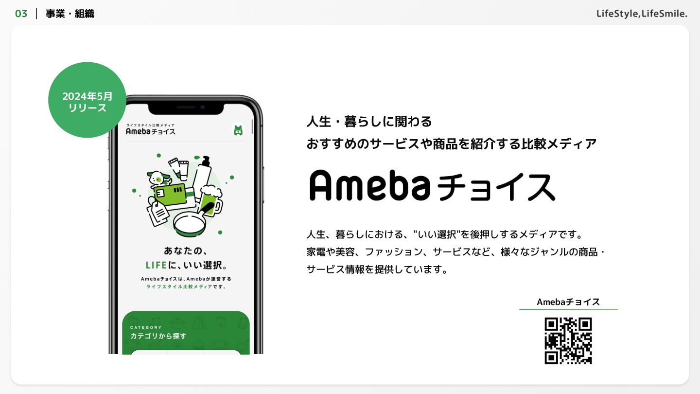 事業・組織 03 人生・暮らしに関わる おすすめのサービスや商品を紹介する比較メディア Amebaチョイス 人生、暮らしにおける、"いい選択"を後押しするメディアです。 家電や美容、ファッション、サービスなど、様々なジャンルの商品・ サービス情報を提供しています。 2024年5月 リリース