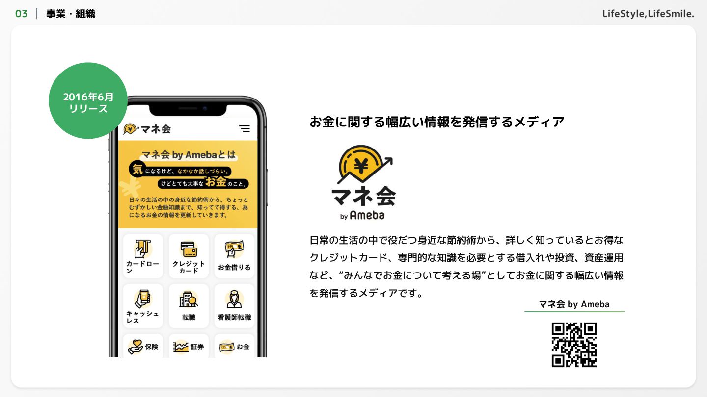 事業・組織 03 お金に関する幅広い情報を発信するメディア マネ会 by Ameba 日常の生活の中で役だつ身近な節約術から、詳しく知っているとお得な クレジットカード、専門的な知識を必要とする借入れや投資、資産運用 など、“みんなでお金について考える場”としてお金に関する幅広い情報 を発信するメディアです。