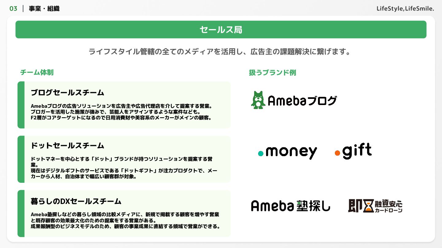 事業・組織 03 チーム体制 扱うブランド例 ライフスタイル管轄の全てのメディアを活用し、広告主の課題解決に繋げます。 セールス局 ブログセールスチーム Amebaブログの広告ソリューションを広告主や広告代理店を介して提案する営業。 ブロガーを活用した施策が強みで、芸能人をアサインするような案件なども。 F2層がコアターゲットになるので日用消費財や美容系のメーカーがメインの顧客。
