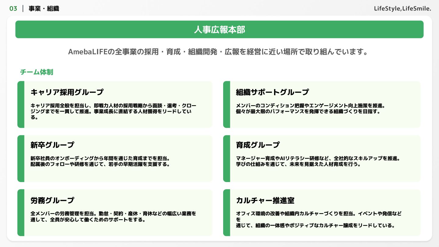 事業・組織 03 AmebaLIFEの全事業の採用・育成・組織開発・広報を経営に近い場所で取り組んでいます。 人事広報本部 チーム体制 キャリア採用グループ キャリア採用全般を担当し、即戦力人材の採用戦略から面談・選考・クロー ジングまでを一貫して推進。事業成長に直結する人材獲得をリードしてい る。 新卒グループ