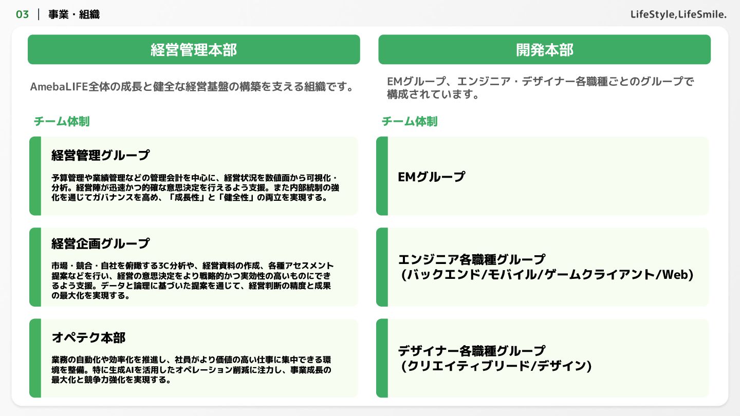 事業・組織 03 経営管理本部 AmebaLIFE全体の成長と健全な経営基盤の構築を支える組織です。 チーム体制 開発本部 EMグループ、エンジニア・デザイナー各職種ごとのグループで 構成されています。 チーム体制 経営管理グループ