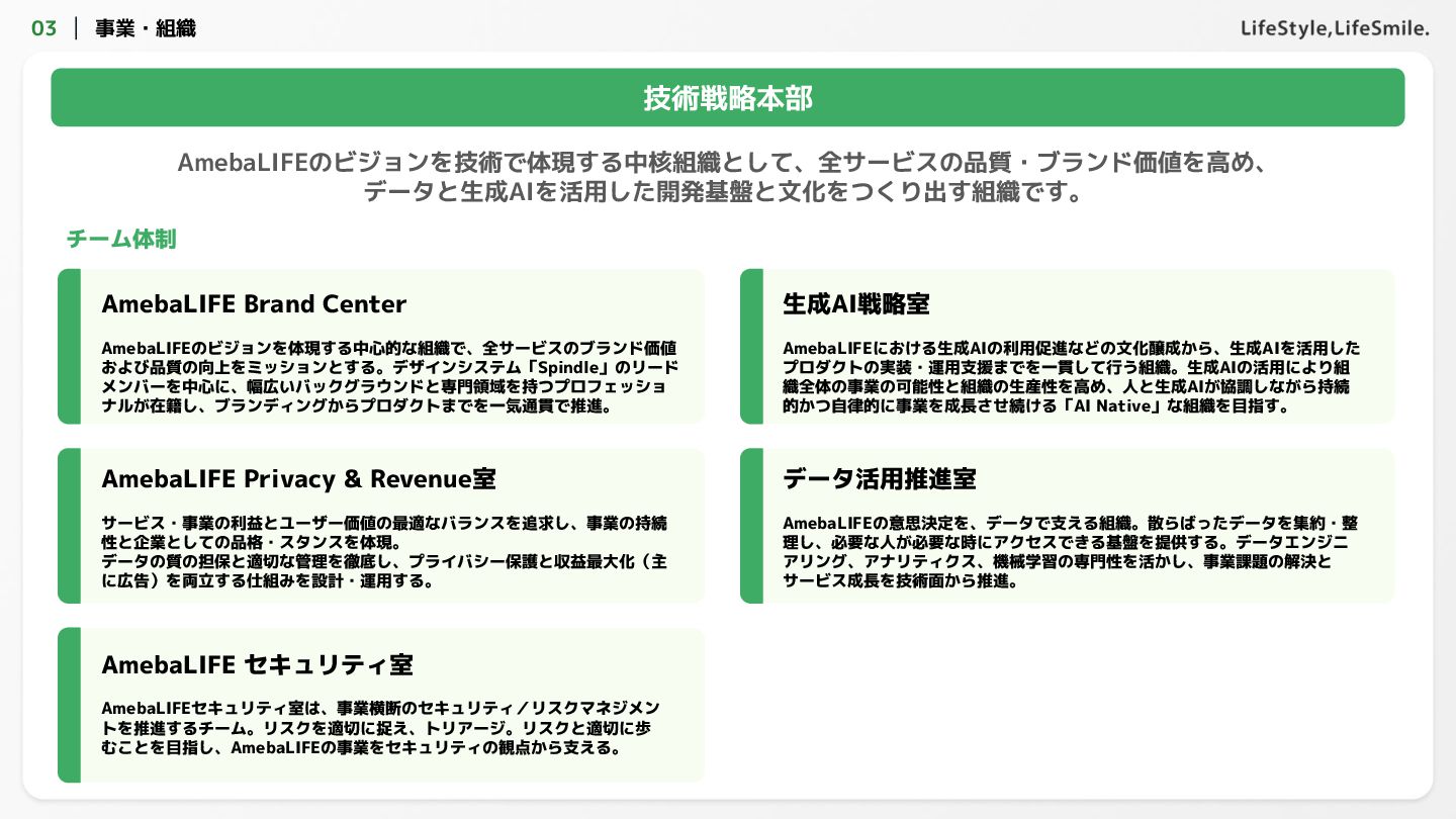 事業・組織 03 AmebaLIFEのビジョンを技術で体現する中核組織として、全サービスの品質・ブランド価値を高め、 データと生成AIを活用した開発基盤と文化をつくり出す組織です。 技術戦略本部 チーム体制 AmebaLIFE Brand Center AmebaLIFEのビジョンを体現する中心的な組織で、全サービスのブランド価値