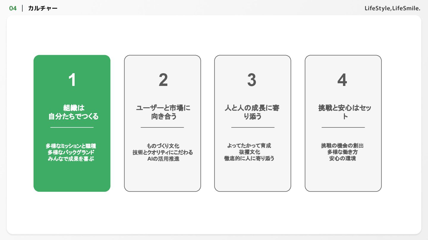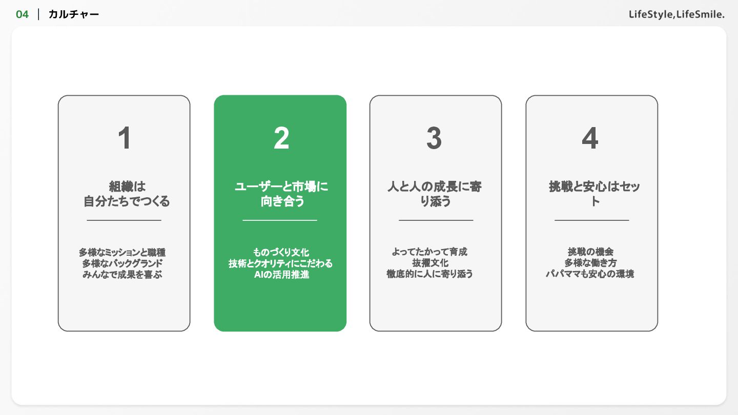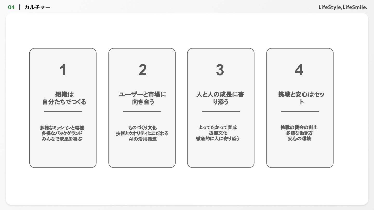 ユーザーと市場に 向き合う ものづくり文化 技術とクオリティにこだわる AIの活用推進 挑戦と安心はセッ ト 挑戦の機会の創出 多様な働き方 安心の環境 1 2 3 4 カルチャー 04