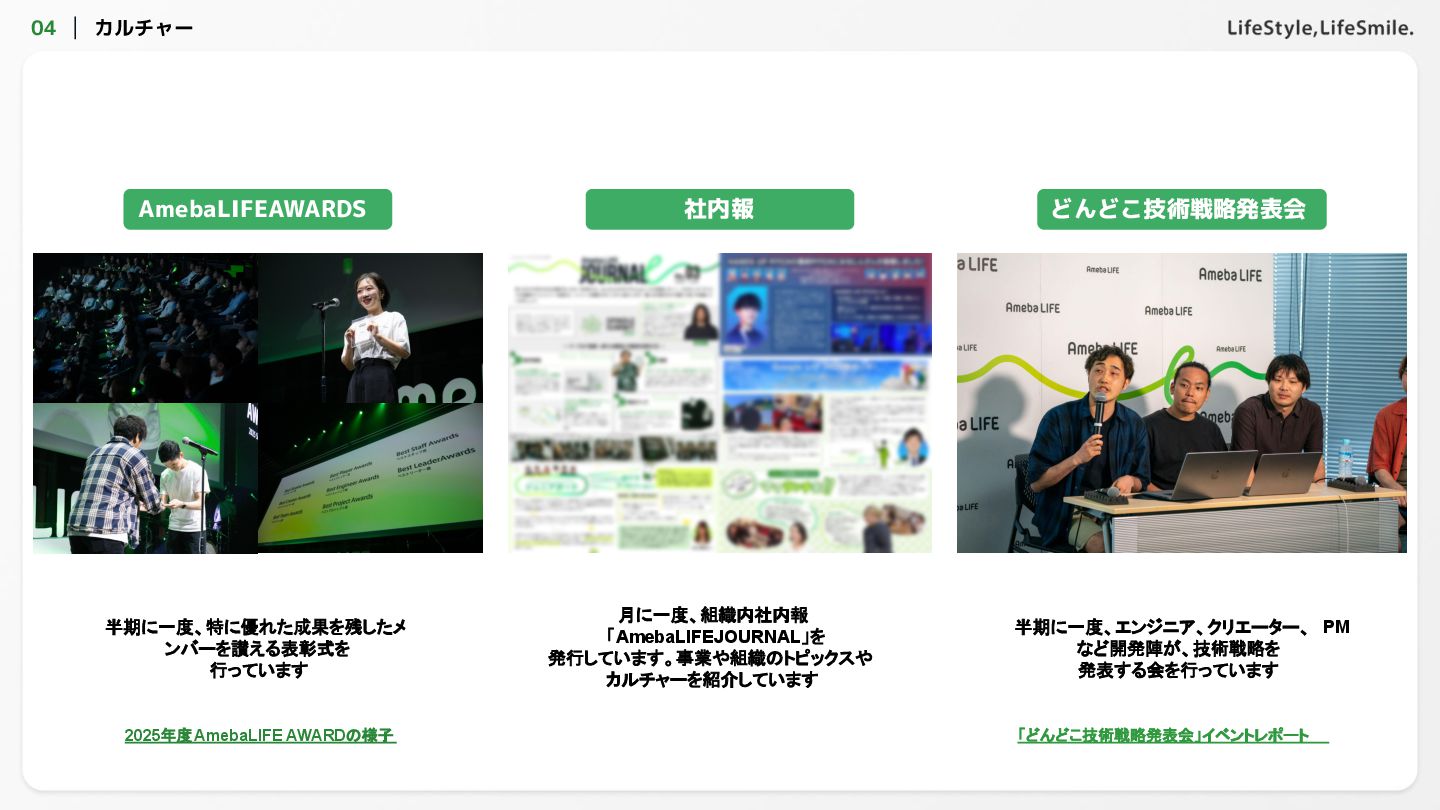 カルチャーを紹介しています どんどこ技術戦略発表会 半期に一度、エンジニア、クリエーター、 PM など開発陣が、技術戦略を 発表する会を行っています 「どんどこ技術戦略発表会」イベントレポート 2025年度AmebaLIFE AWARDの様子