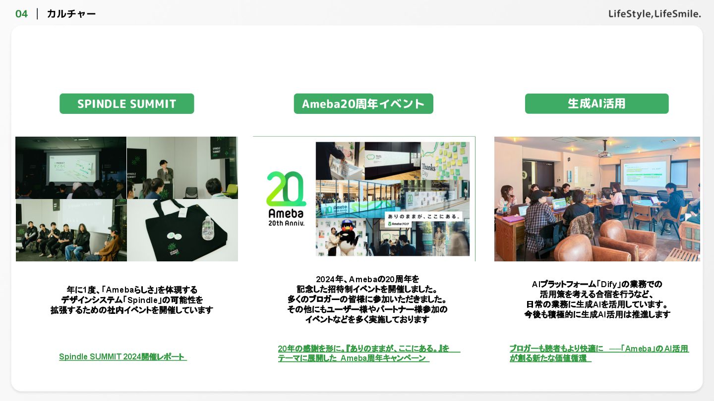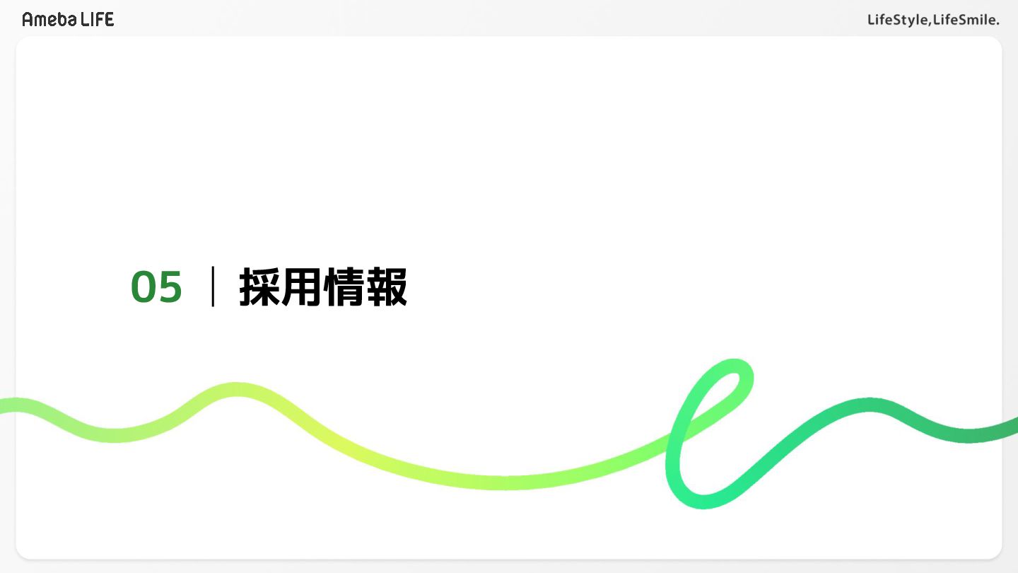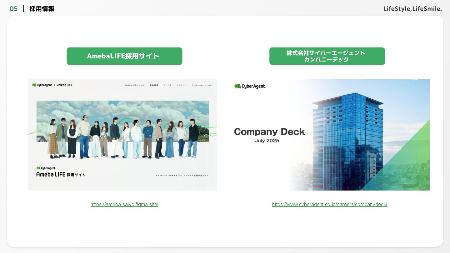 採用情報 05 AmebaLIFE採用サイト 株式会社サイバーエージェント カンパニーデック https://www.cyberagent.co.jp/careers/companydeck/ https://ameba-saiyo.figma.site/