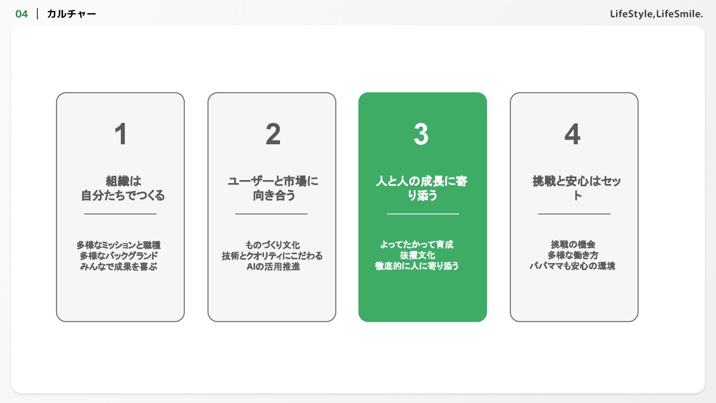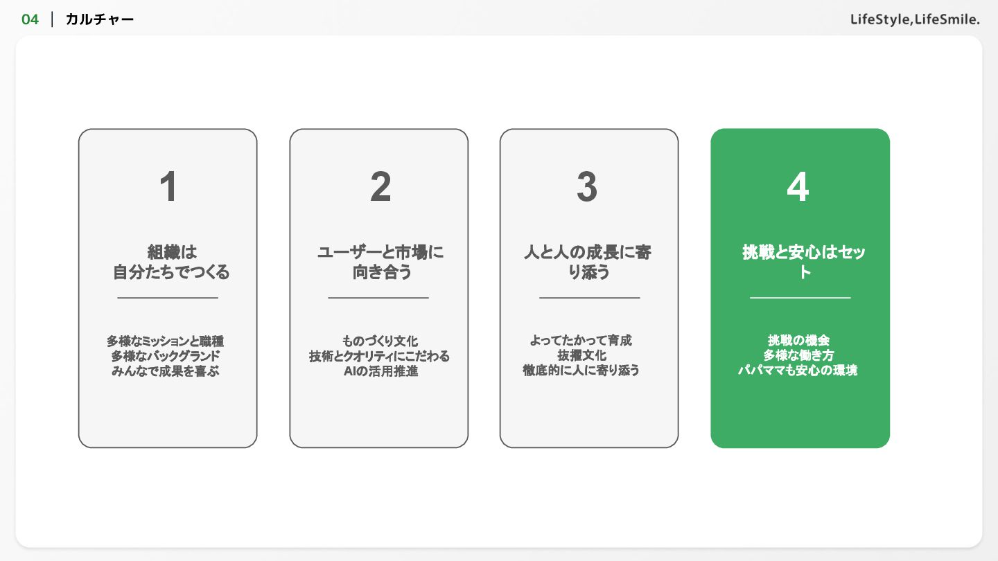 ユーザーと市場に 向き合う ものづくり文化 技術とクオリティにこだわる AIの活用推進 挑戦と安心はセッ ト 挑戦の機会 多様な働き方 パパママも安心の環境 1 2 3 4 カルチャー 04