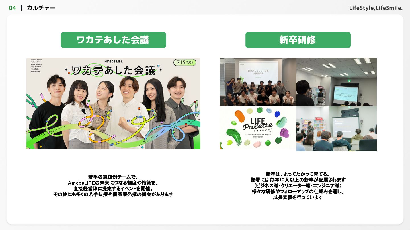 カルチャー 04 若手の選抜制チームで、 AmebaLIFEの未来につなる制度や施策を、 直接経営陣に提案するイベントを開催。 その他にも多くの若手抜擢や優秀層発掘の機会があります ワカテあした会議 新卒研修 新卒は、よってたかって育てる。 部署には毎年10人以上の新卒が配属されます