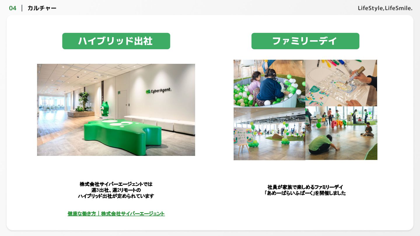 カルチャー 04 株式会社サイバーエージェントでは 週3出社、週2リモートの ハイブリッド出社が定められています ハイブリッド出社 ファミリーデイ 社員が家族で楽しめるファミリーデイ 「あめーばらいふぱーく」を開催しました 健康な働き方|株式会社サイバーエージェント