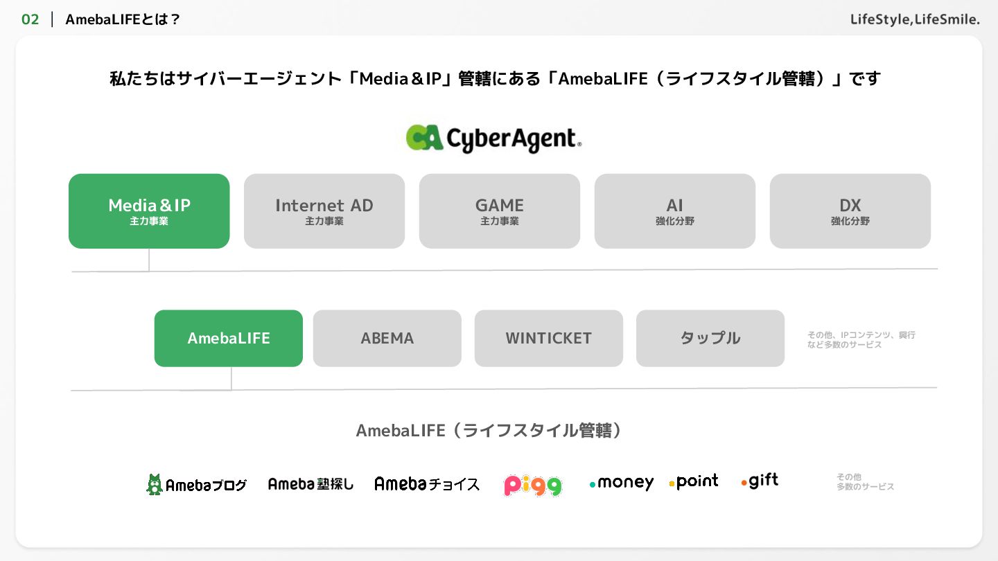 AmebaLIFEとは? 02 私たちはサイバーエージェント「Media&IP」管轄にある「AmebaLIFE(ライフスタイル管轄)」です Media&IP 主力事業 Internet AD 主力事業 GAME 主力事業