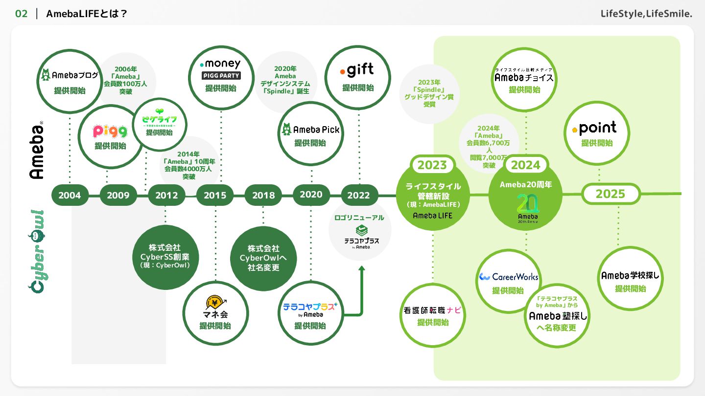 会員数4000万人 突破 ライフスタイル 管轄新設 (現:AmebaLIFE) 2023 2018 株式会社 CyberOwlへ 社名変更 2012 2015 2020 Ameba20周年 2024 2025 2024年 「Ameba」 会員数6,700万 人 閲覧7,000万 突破 提供開始 2022 提供開始 提供開始 2006年 「Ameba」 会員数100万人 突破 へ名称変更 「テラコヤプラス by Ameba」から 提供開始 2023年 「Spindle」 グッドデザイン賞 受賞 提供開始 提供開始 提供開始 提供開始 株式会社 CyberSS創業 (現:CyberOwl) 提供開始 提供開始 提供開始 ロゴリニューアル 提供開始 提供開始