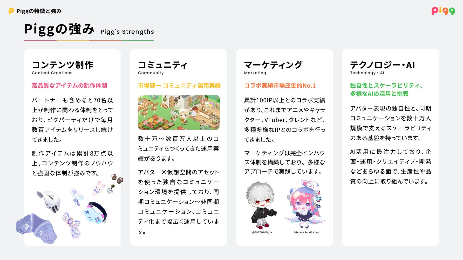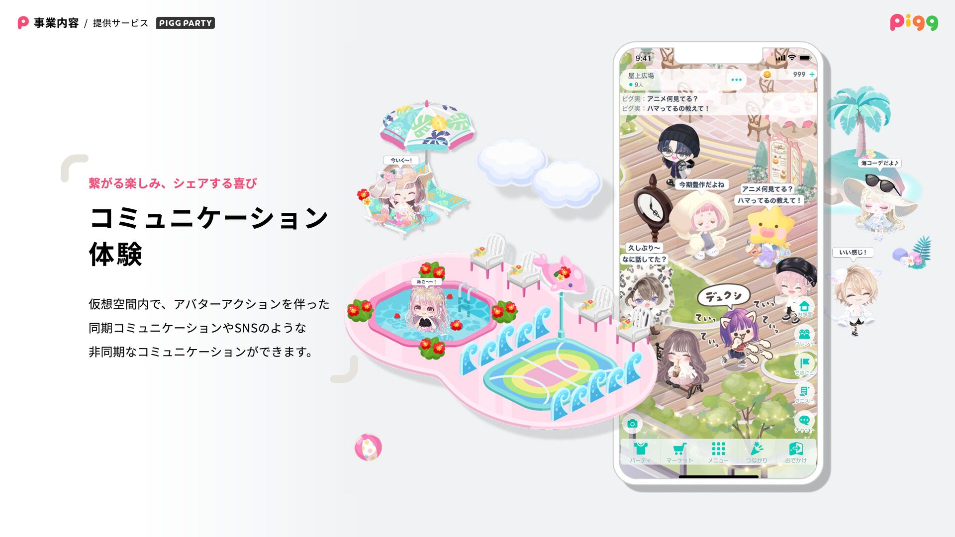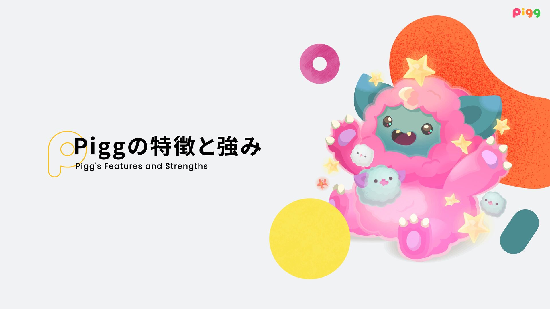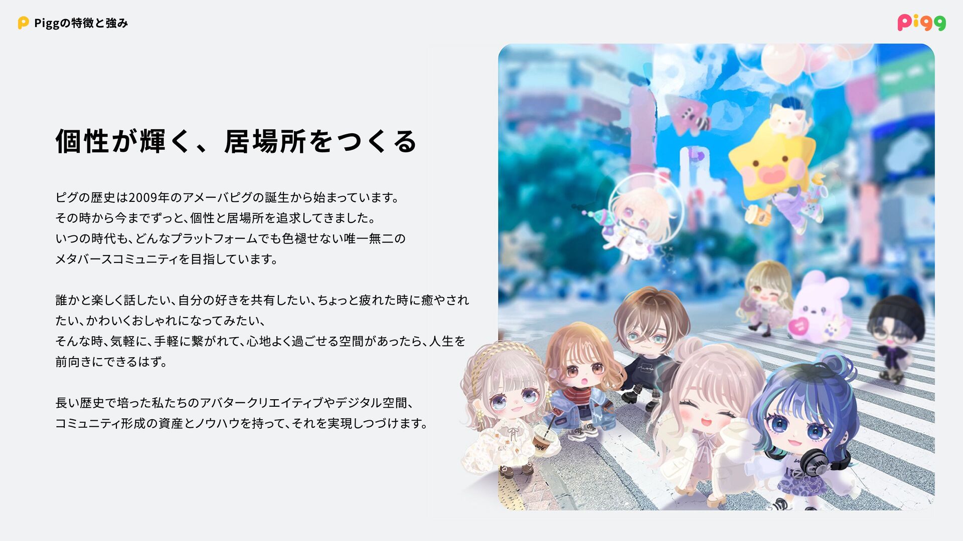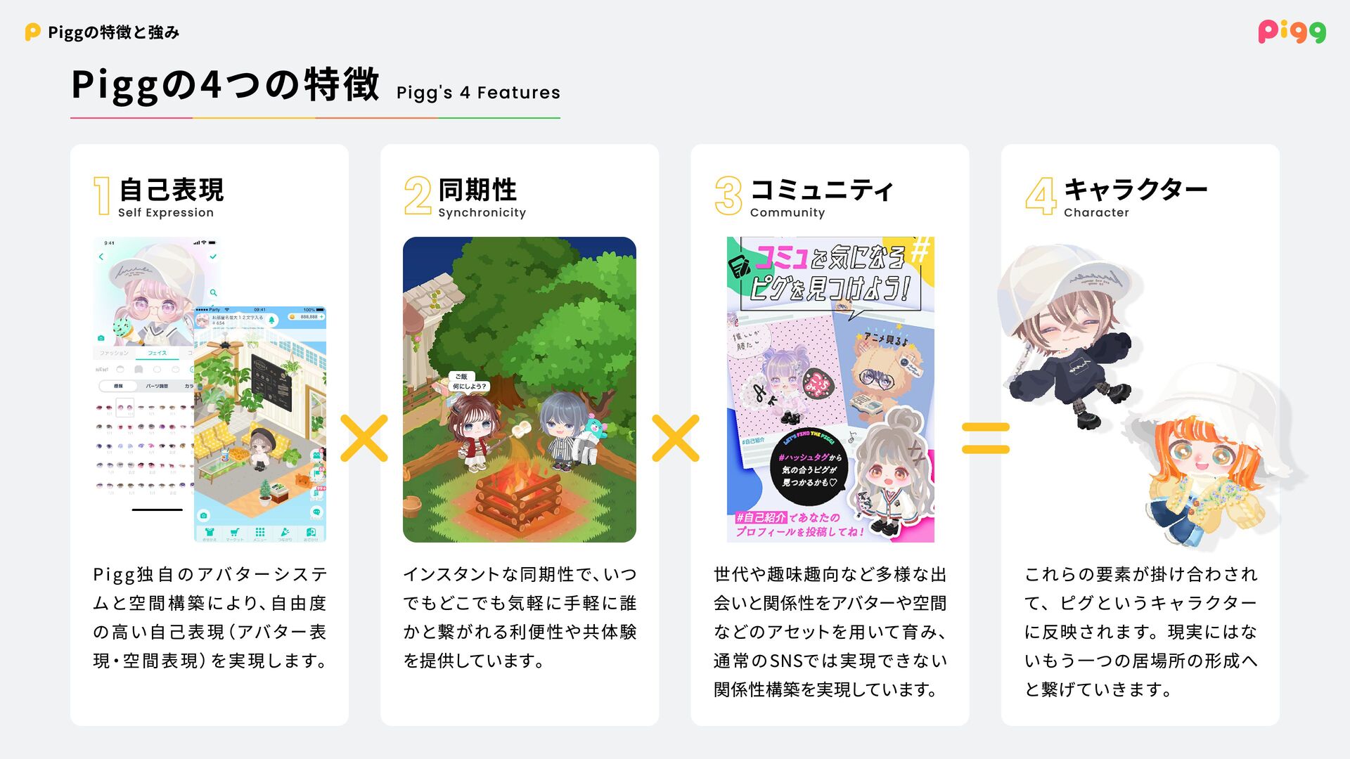 でもどこでも気軽に手軽に誰 かと繋がれる利便性や共体験 を提供しています。 コミュニティ Community 世代や趣味趣向など多様な出 会いと関係性をアバターや空間 などのアセットを用いて育み、 通常のSNSでは実現できない 関係性構築を実現しています。 キャラクター Character これらの要素が掛け合わされ て、ピグというキャラクター に反映されます。現実にはな いもう一つの居場所の形成へ と繋げていきます。 Piggの特徴と強み Piggの4つの特徴 P igg' s 4 F eatures