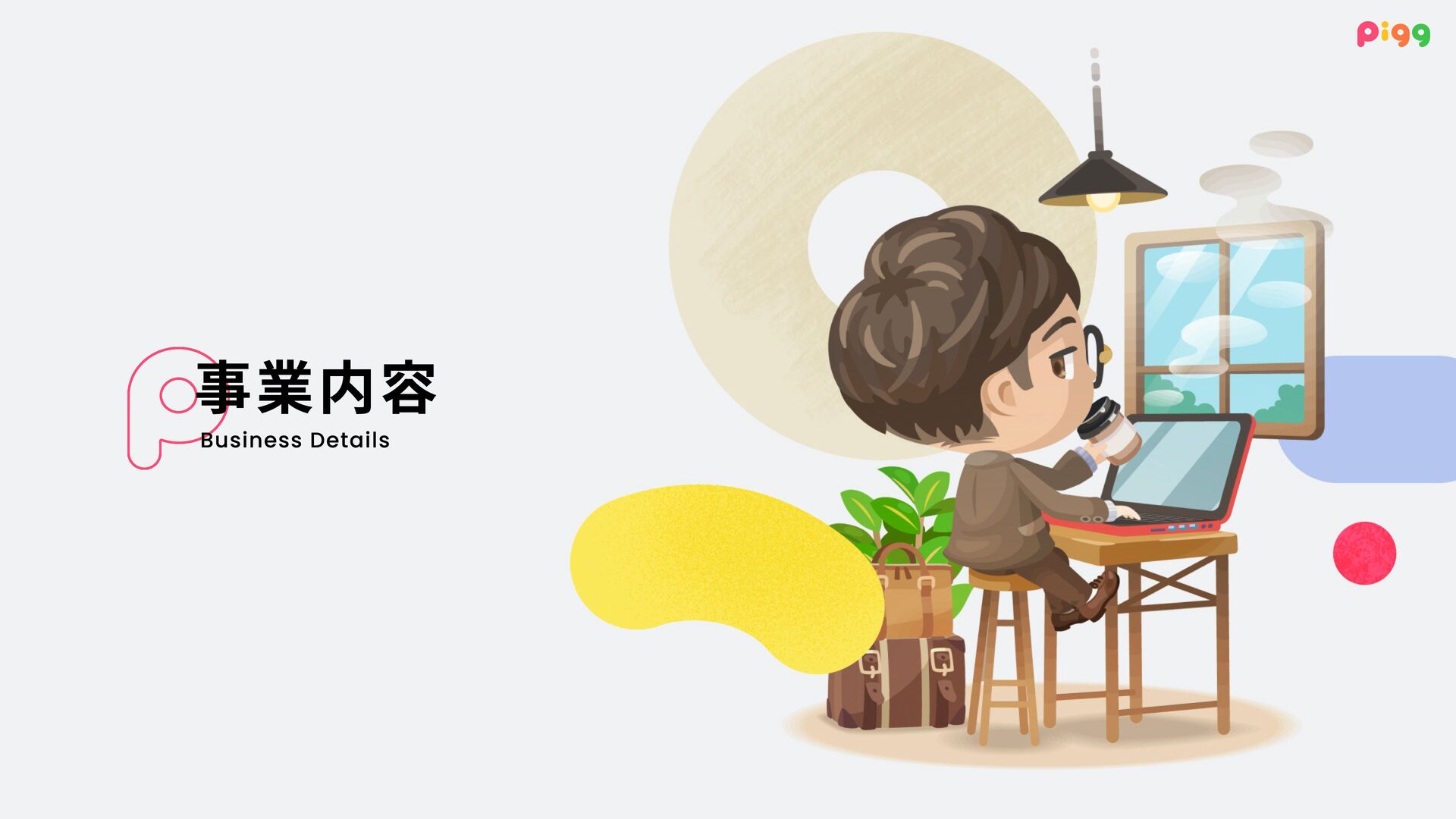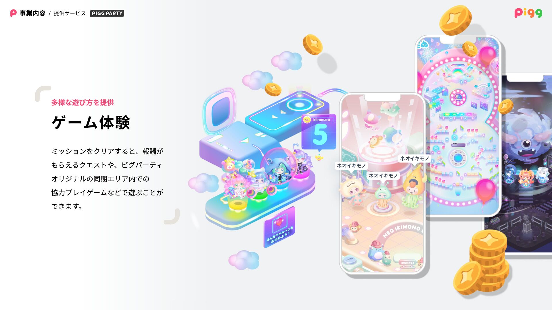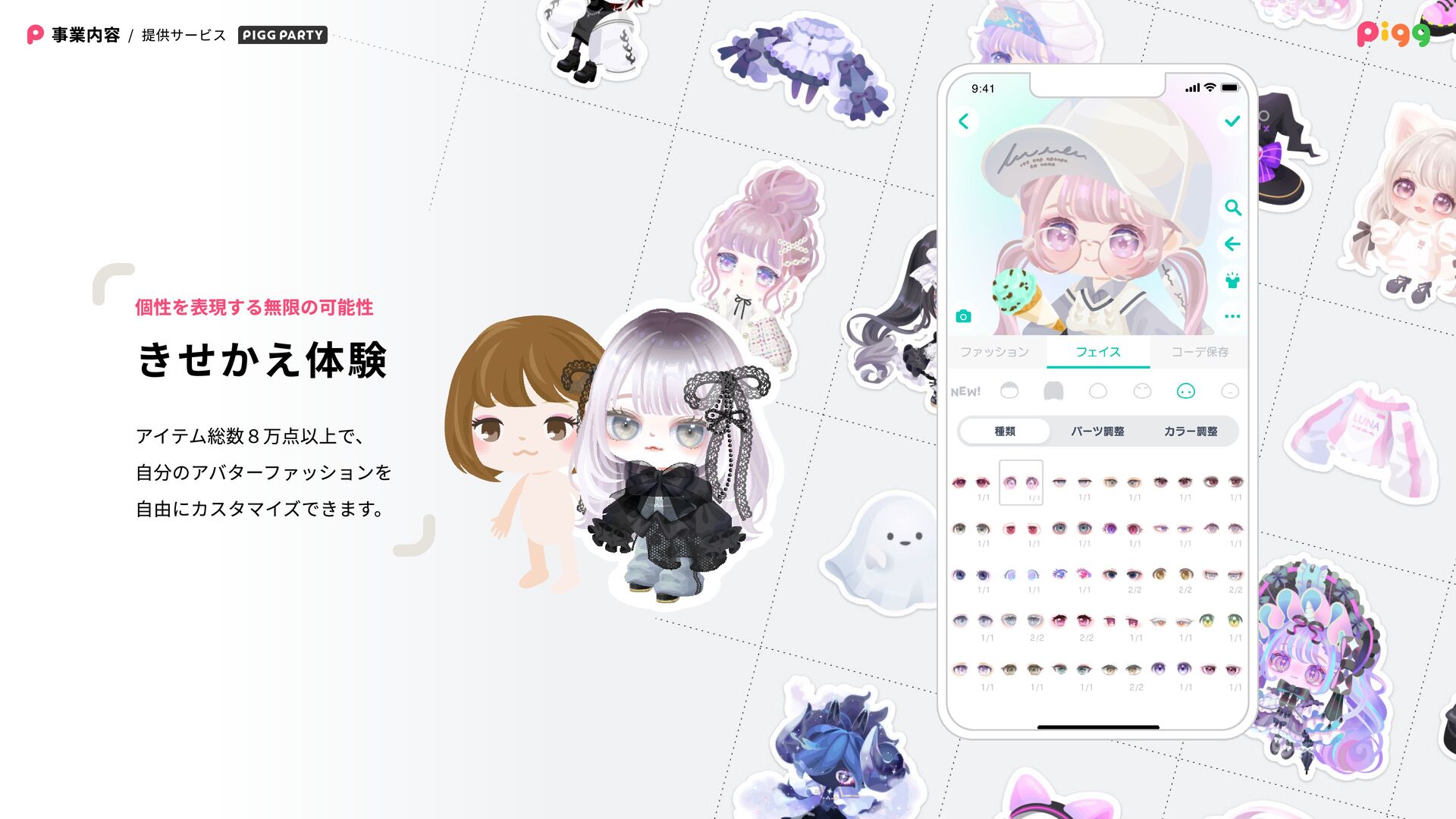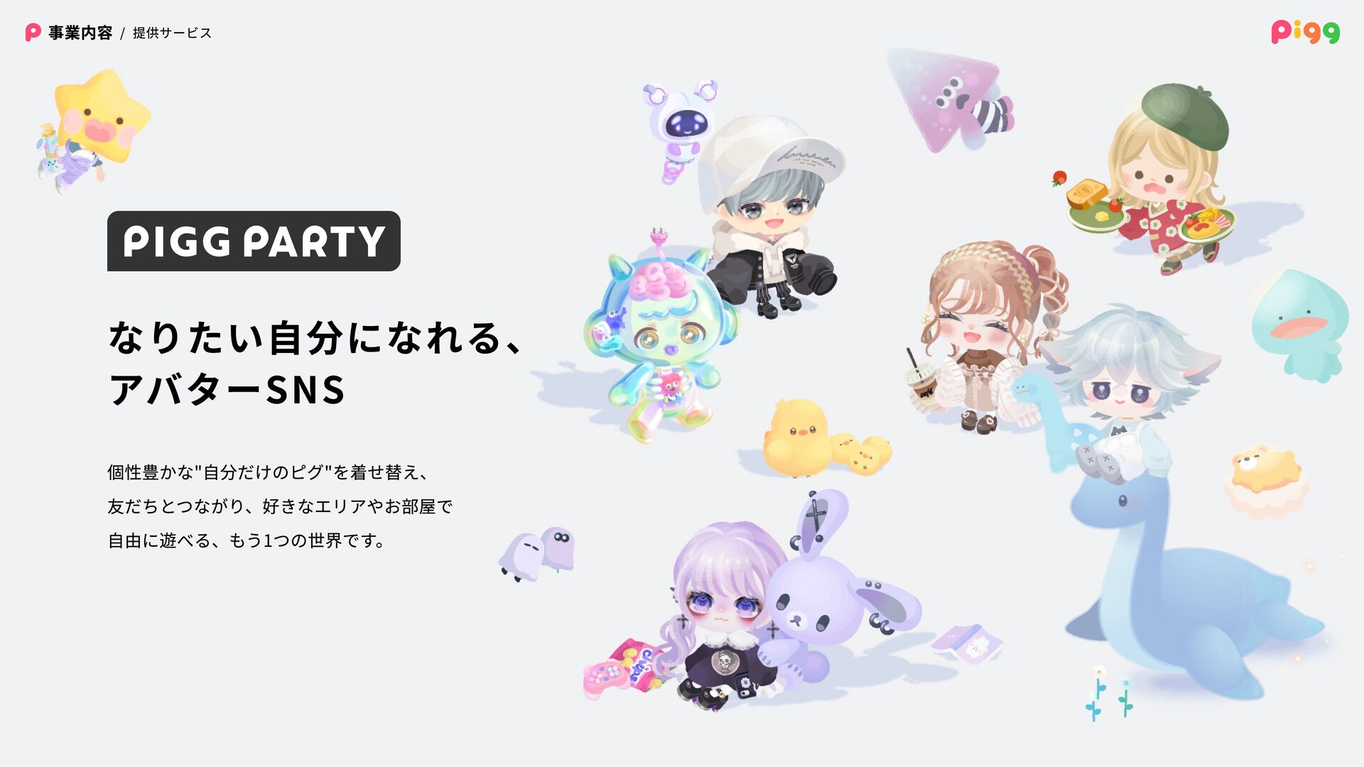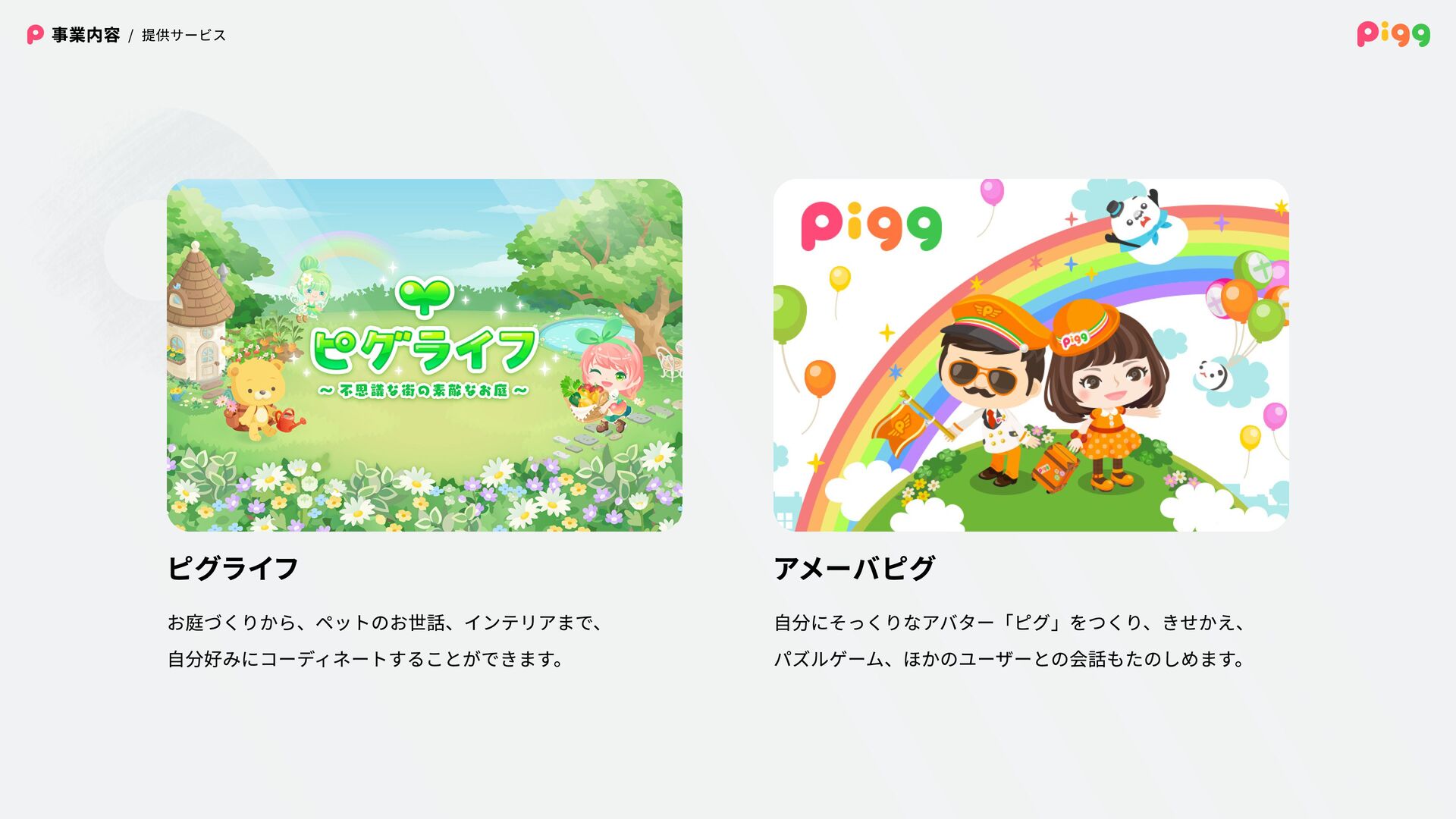 でもどこでも気軽に手軽に誰 かと繋がれる利便性や共体験 を提供しています。 コミュニティ Community 世代や趣味趣向など多様な出 会いと関係性をアバターや空間 などのアセットを用いて育み、 通常のSNSでは実現できない 関係性構築を実現しています。 キャラクター Character これらの要素が掛け合わされ て、ピグというキャラクター に反映されます。現実にはな いもう一つの居場所の形成へ と繋げていきます。 Piggの特徴と強み Piggの4つの特徴 P igg' s 4 F eatures