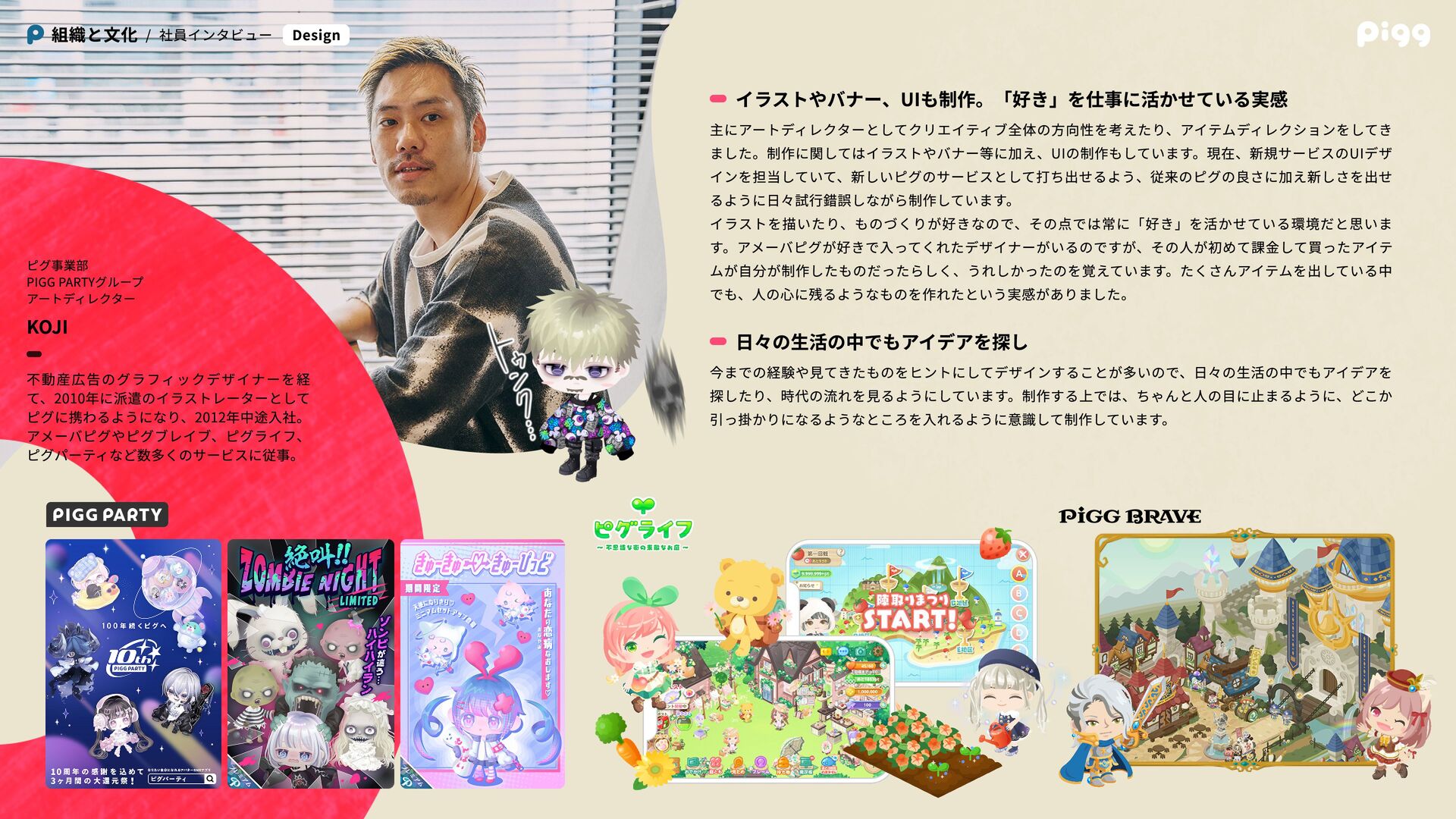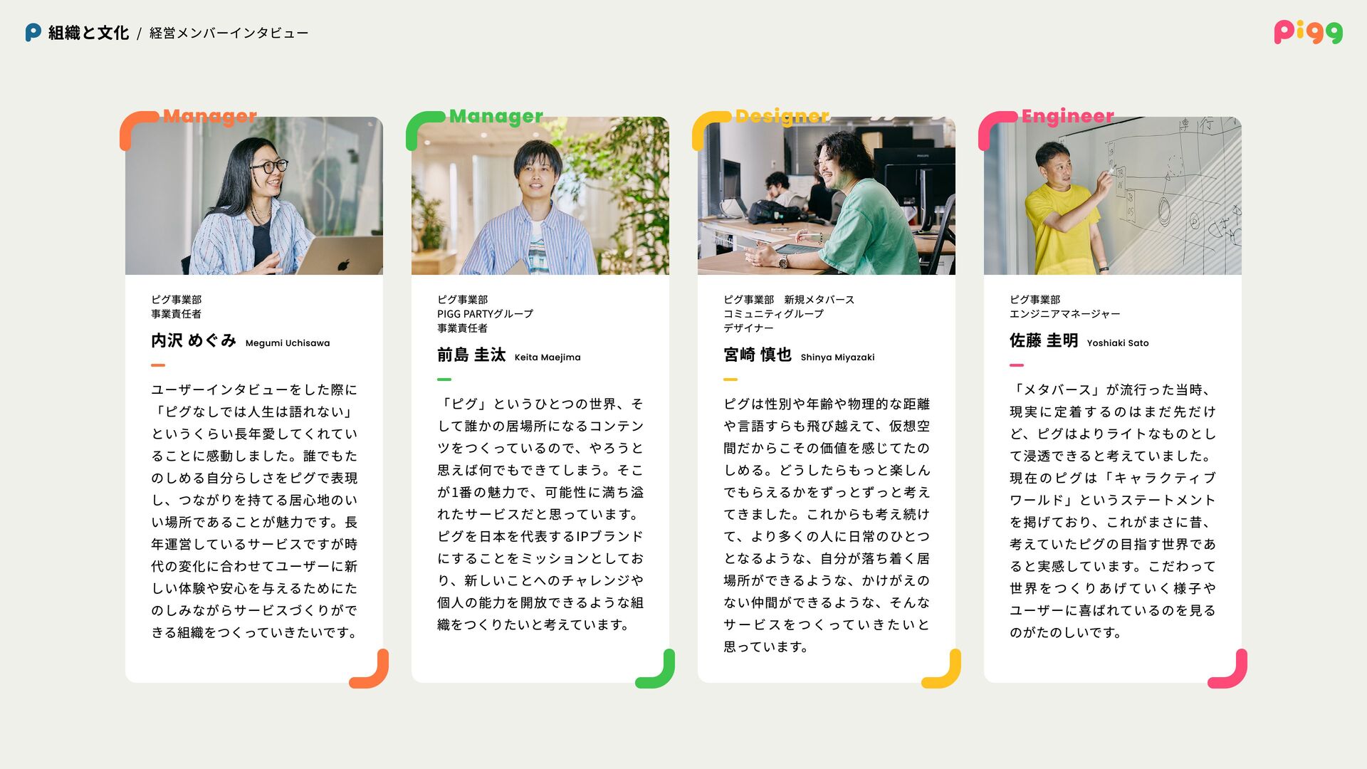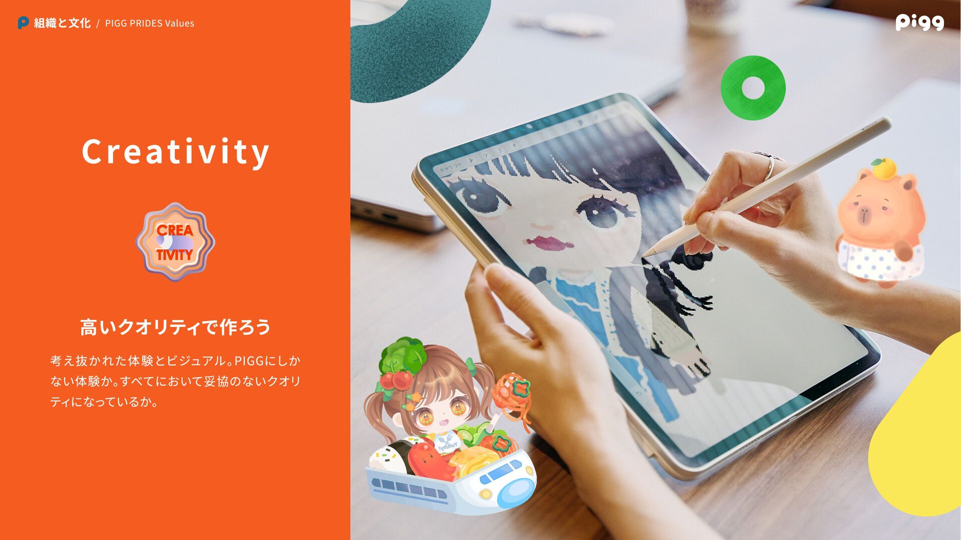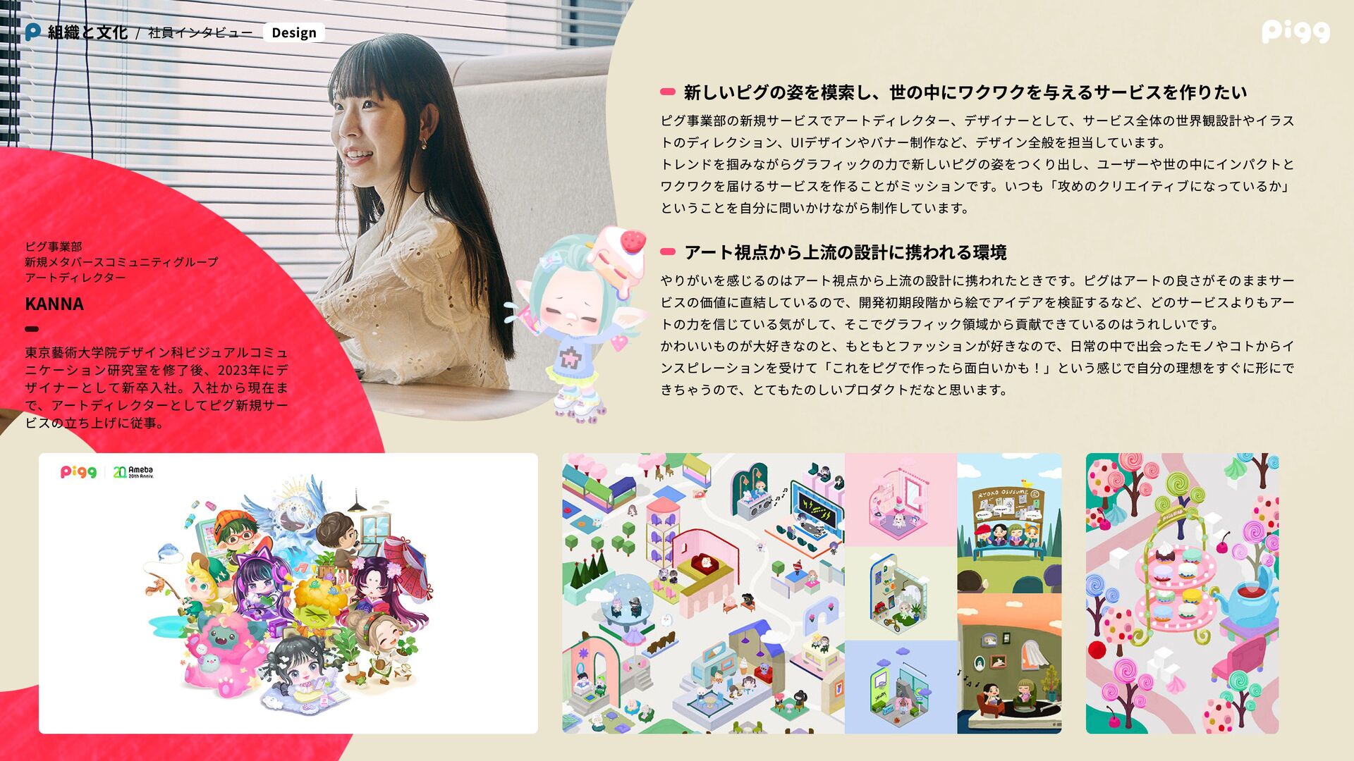 でもどこでも気軽に手軽に誰 かと繋がれる利便性や共体験 を提供しています。 コミュニティ Community 世代や趣味趣向など多様な出 会いと関係性をアバターや空間 などのアセットを用いて育み、 通常のSNSでは実現できない 関係性構築を実現しています。 キャラクター Character これらの要素が掛け合わされ て、ピグというキャラクター に反映されます。現実にはな いもう一つの居場所の形成へ と繋げていきます。 Piggの特徴と強み Piggの4つの特徴 P igg' s 4 F eatures