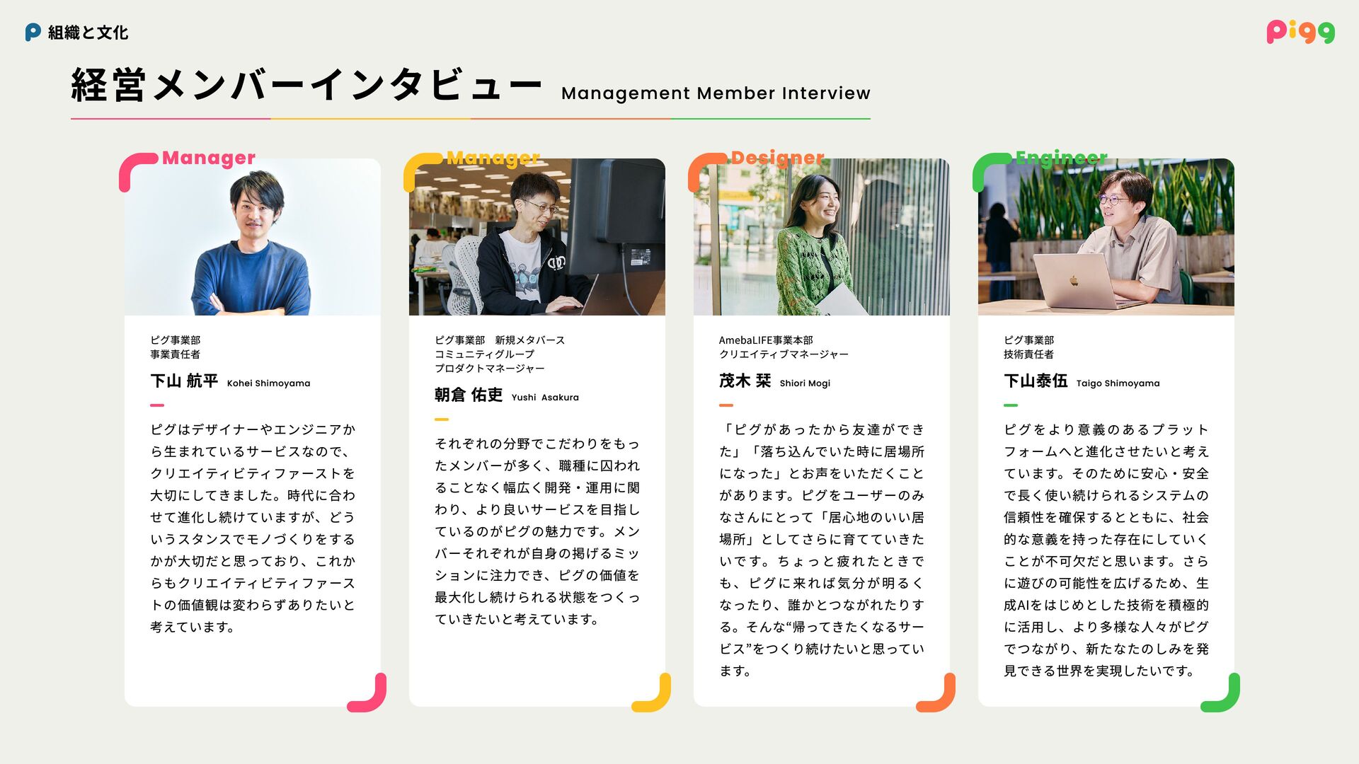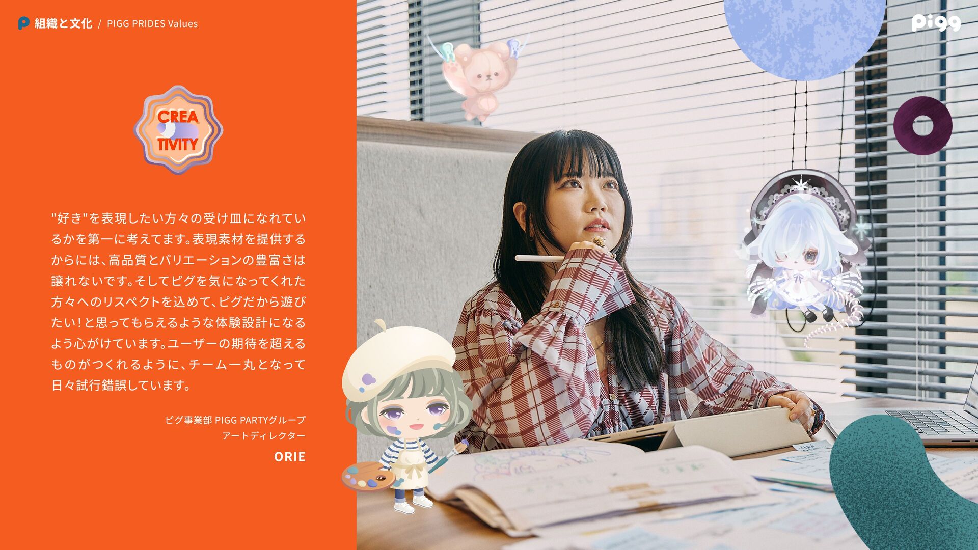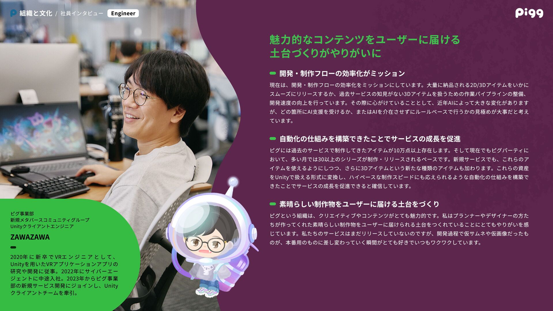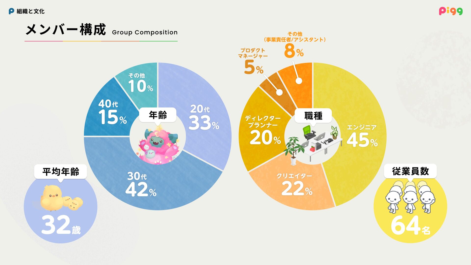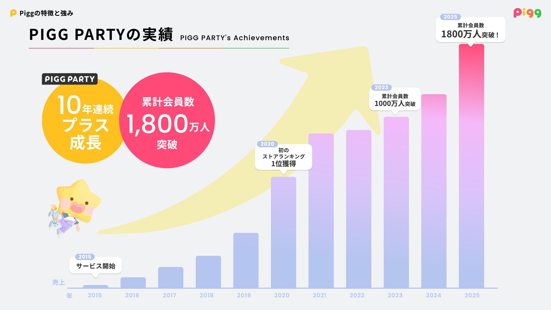でもどこでも気軽に手軽に誰 かと繋がれる利便性や共体験 を提供しています。 コミュニティ Community 世代や趣味趣向など多様な出 会いと関係性をアバターや空間 などのアセットを用いて育み、 通常のSNSでは実現できない 関係性構築を実現しています。 キャラクター Character これらの要素が掛け合わされ て、ピグというキャラクター に反映されます。現実にはな いもう一つの居場所の形成へ と繋げていきます。 Piggの特徴と強み Piggの4つの特徴 P igg' s 4 F eatures