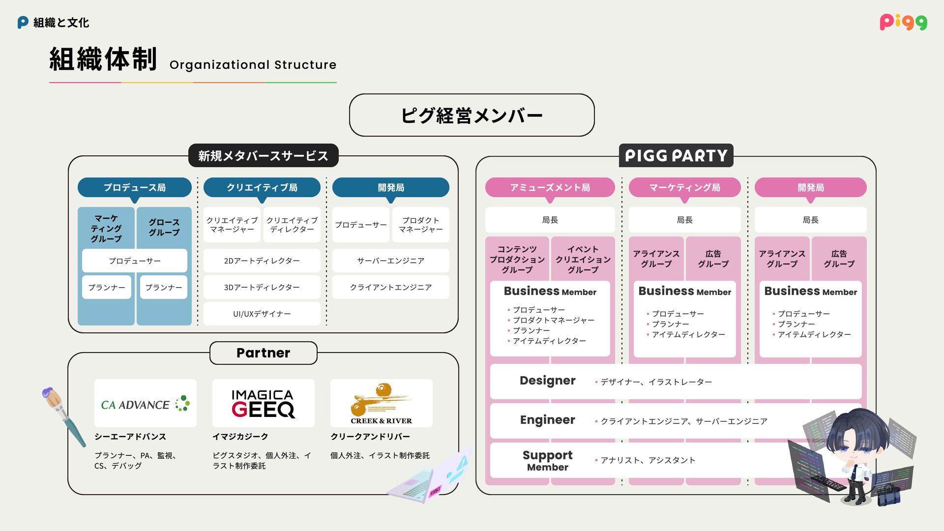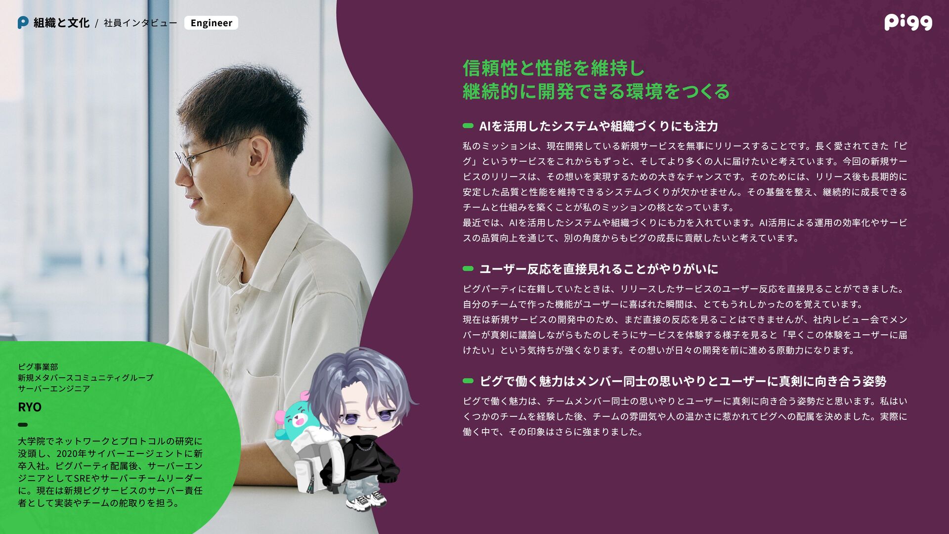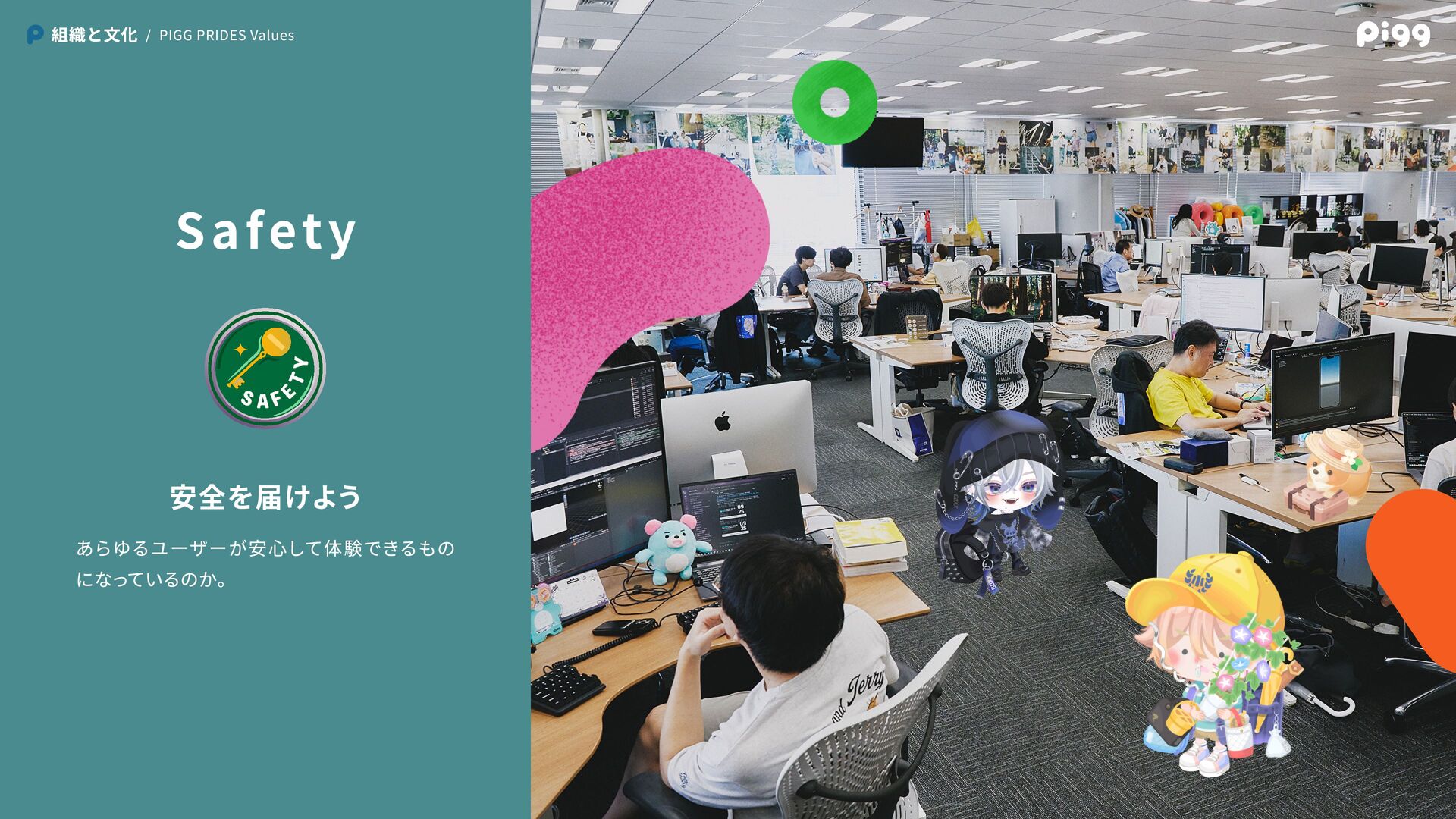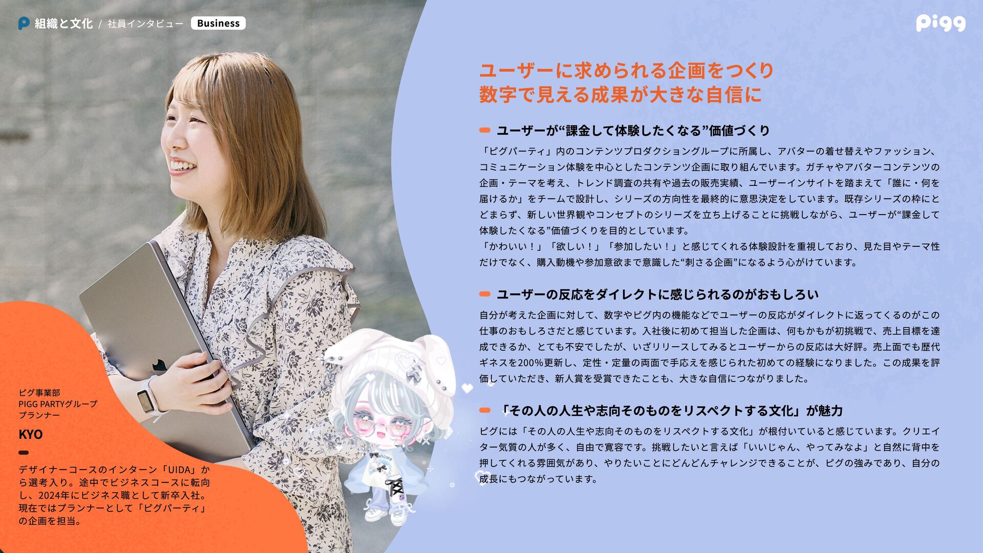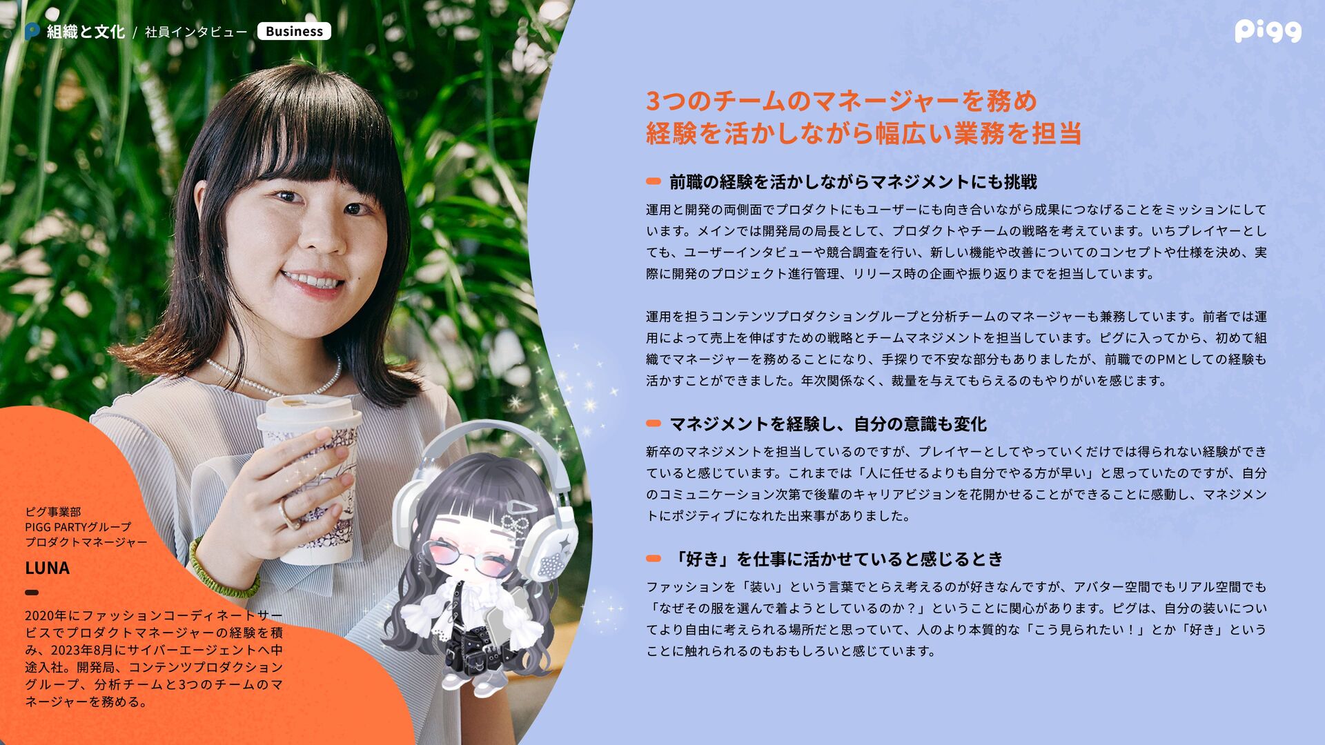 でもどこでも気軽に手軽に誰 かと繋がれる利便性や共体験 を提供しています。 コミュニティ Community 世代や趣味趣向など多様な出 会いと関係性をアバターや空間 などのアセットを用いて育み、 通常のSNSでは実現できない 関係性構築を実現しています。 キャラクター Character これらの要素が掛け合わされ て、ピグというキャラクター に反映されます。現実にはな いもう一つの居場所の形成へ と繋げていきます。 Piggの特徴と強み Piggの4つの特徴 P igg' s 4 F eatures