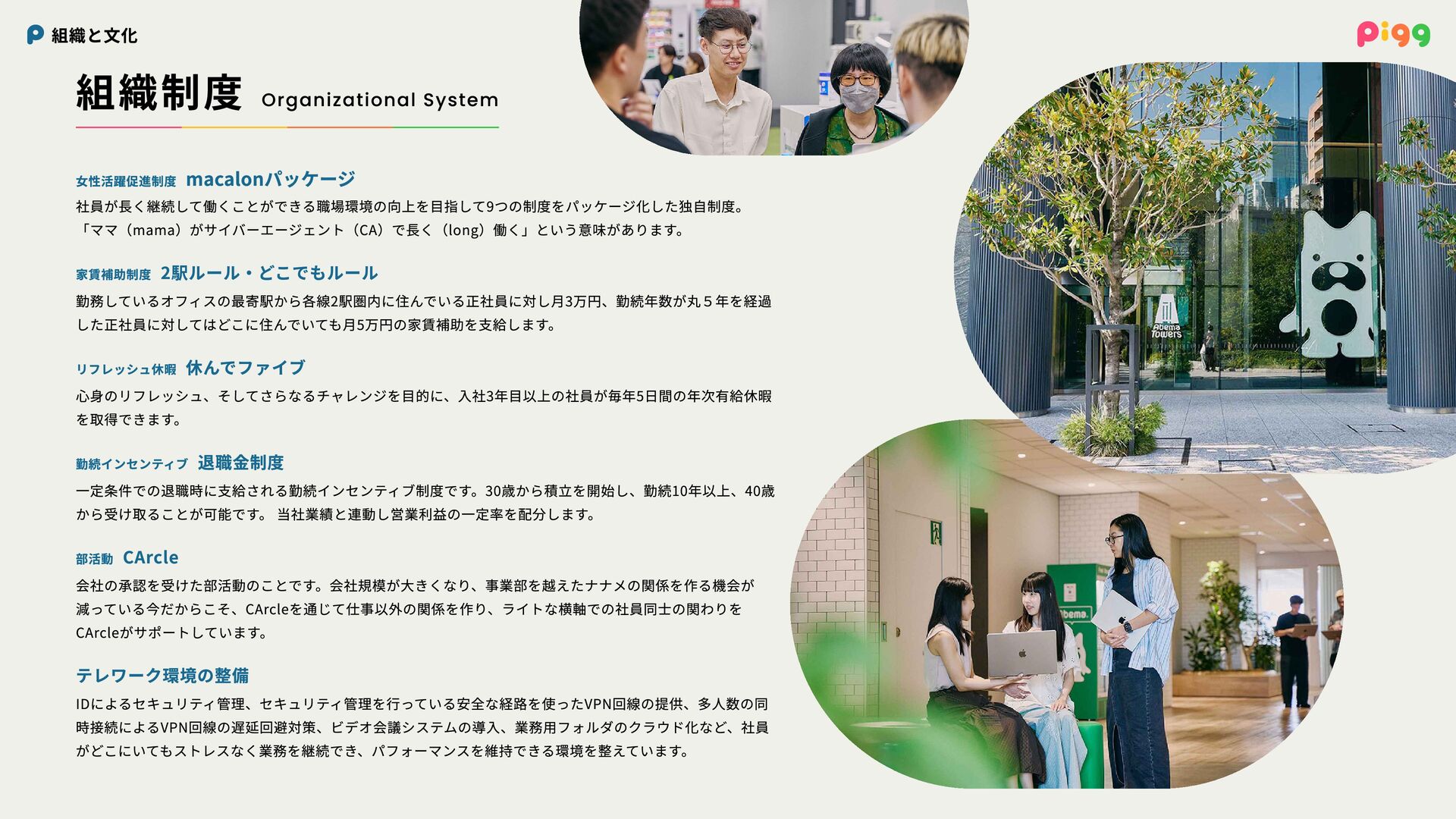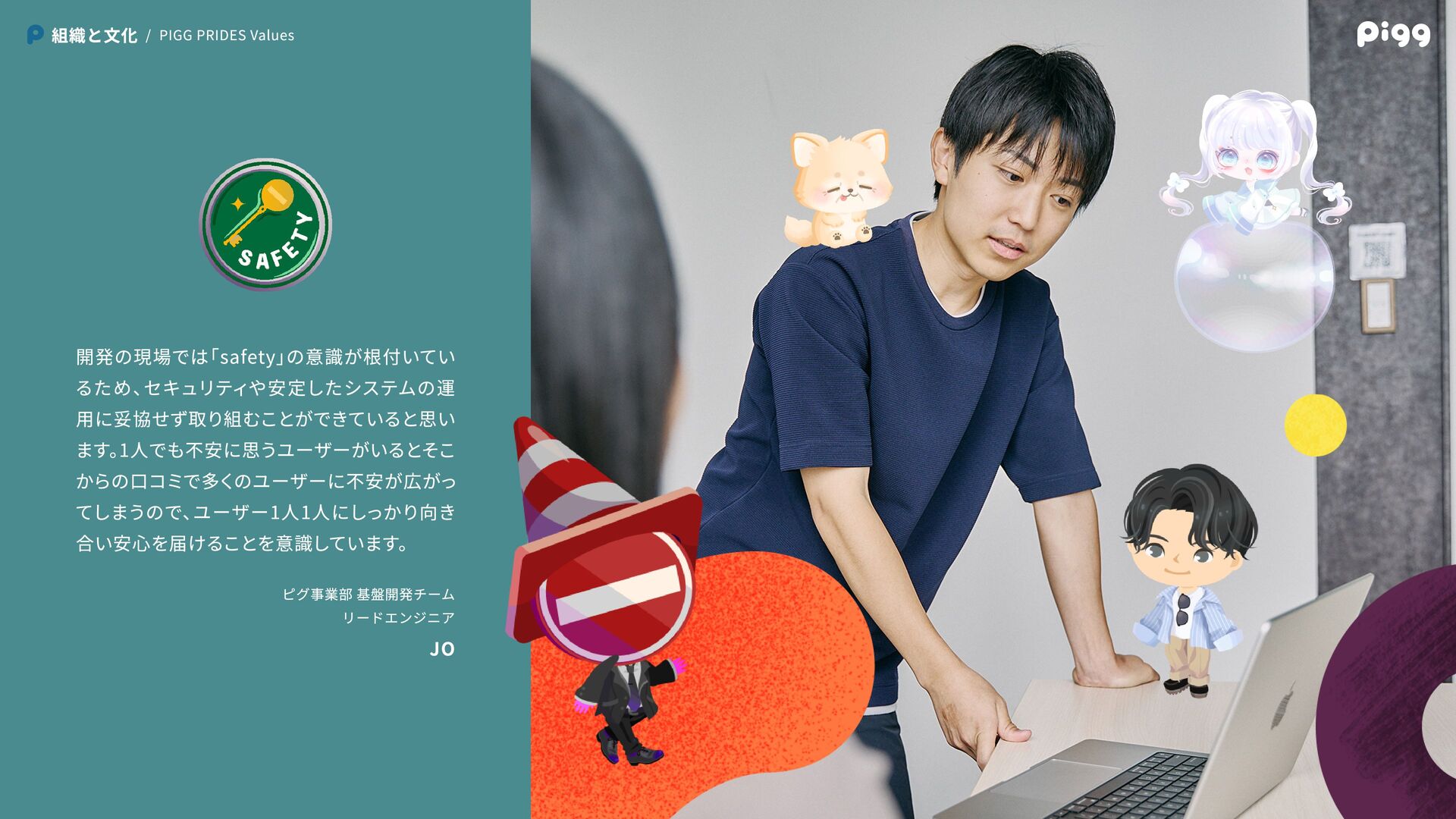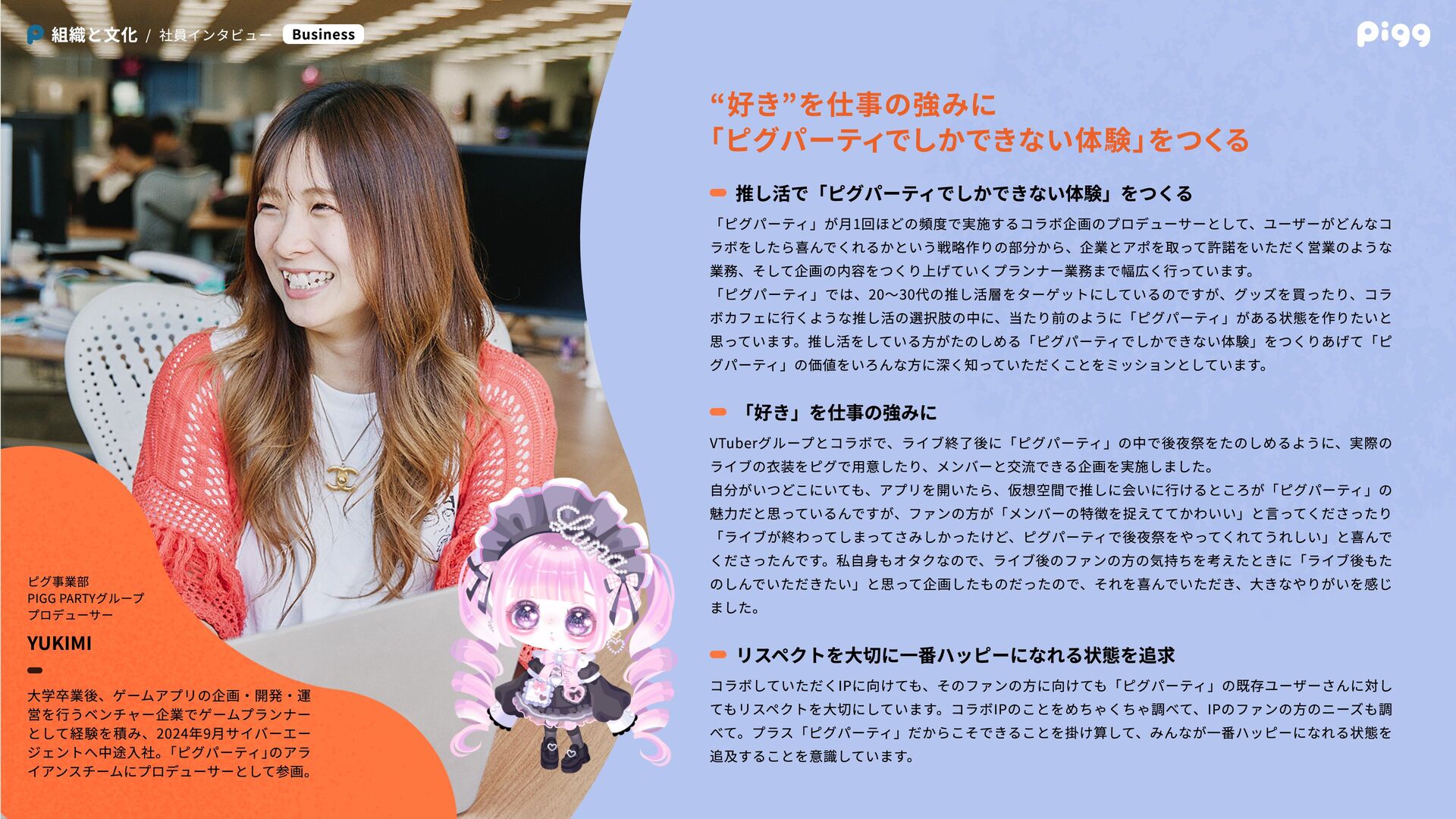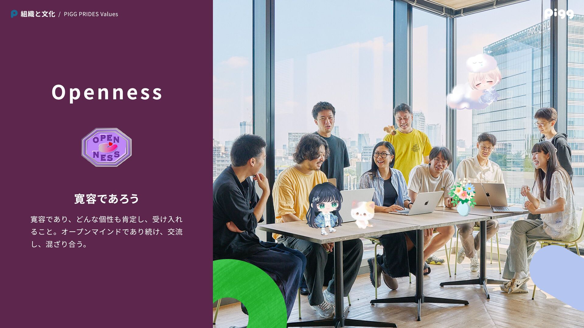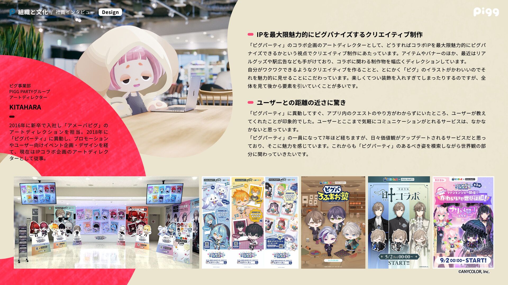 でもどこでも気軽に手軽に誰 かと繋がれる利便性や共体験 を提供しています。 コミュニティ Community 世代や趣味趣向など多様な出 会いと関係性をアバターや空間 などのアセットを用いて育み、 通常のSNSでは実現できない 関係性構築を実現しています。 キャラクター Character これらの要素が掛け合わされ て、ピグというキャラクター に反映されます。現実にはな いもう一つの居場所の形成へ と繋げていきます。 Piggの特徴と強み Piggの4つの特徴 P igg' s 4 F eatures
