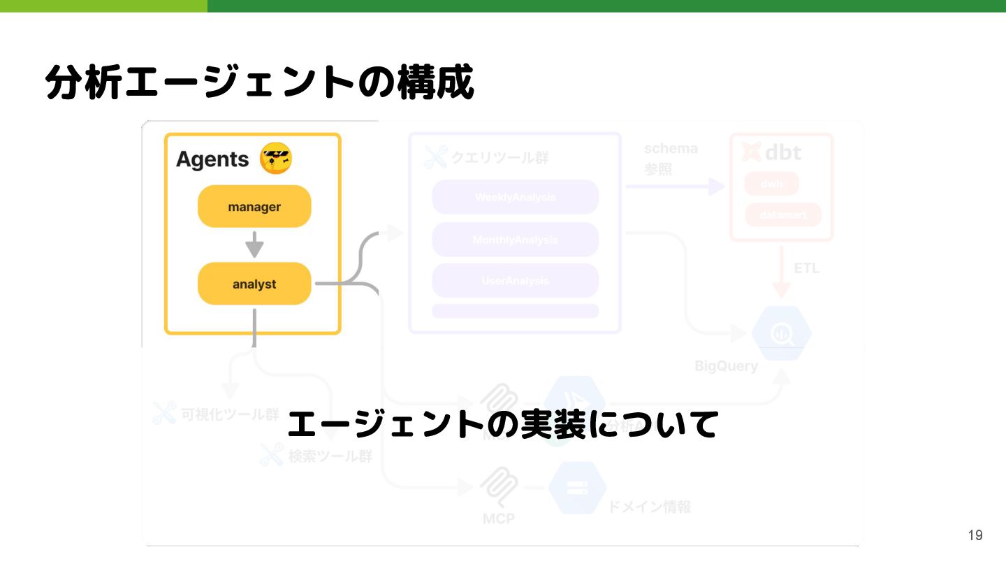 分析エージェントの構成 (再掲) 27 なぜツール定義にMCPを採用? なぜワークフローが組めないフレームワークを採用? LLM関連領域の技術発展が日進月歩なため