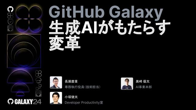 GitHub Galaxy 生成AIがもたらす 変革 長瀬慶重 専務執行役員(技術担当) 小塚健太 Developer Productivity室 黒崎