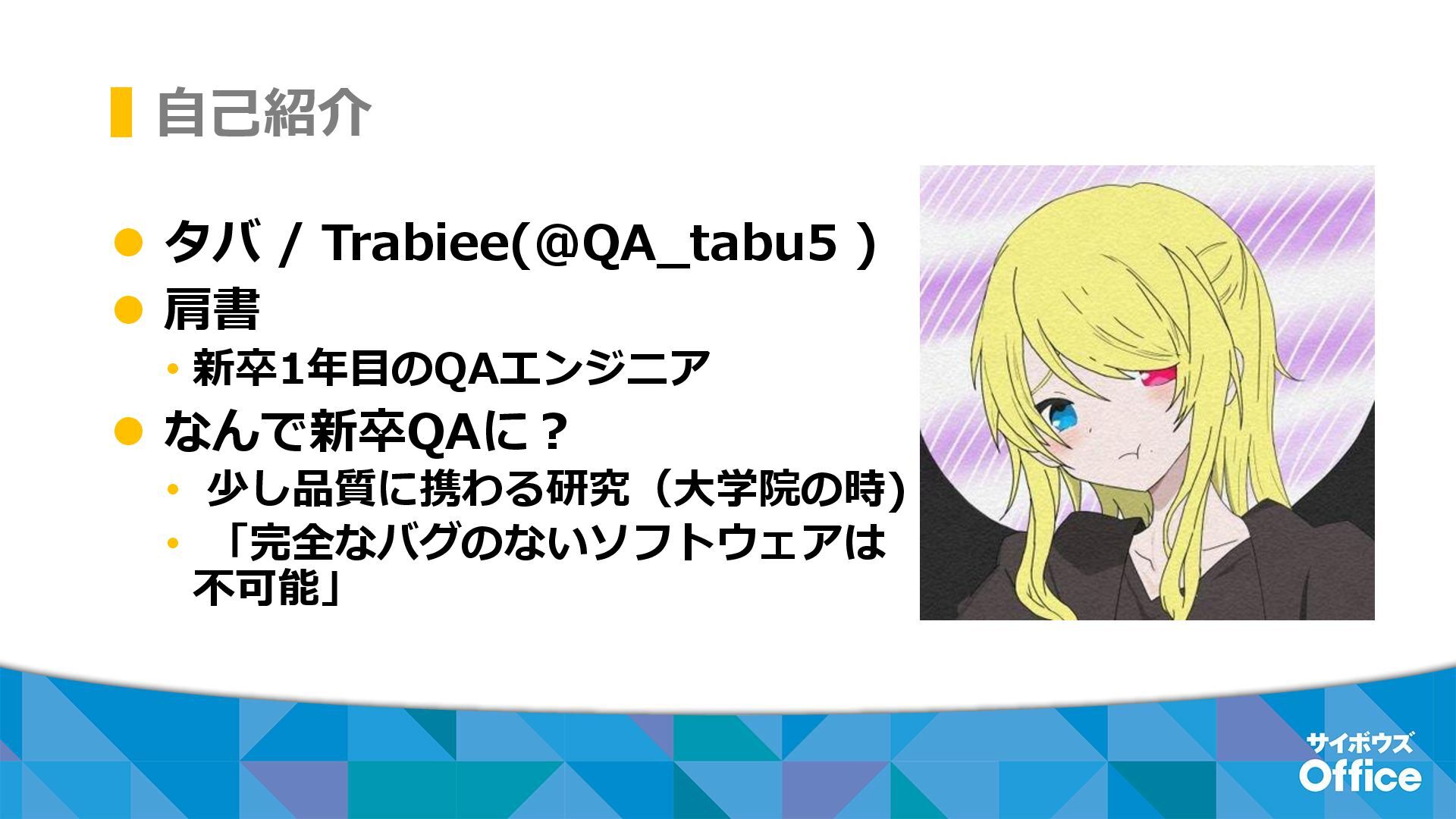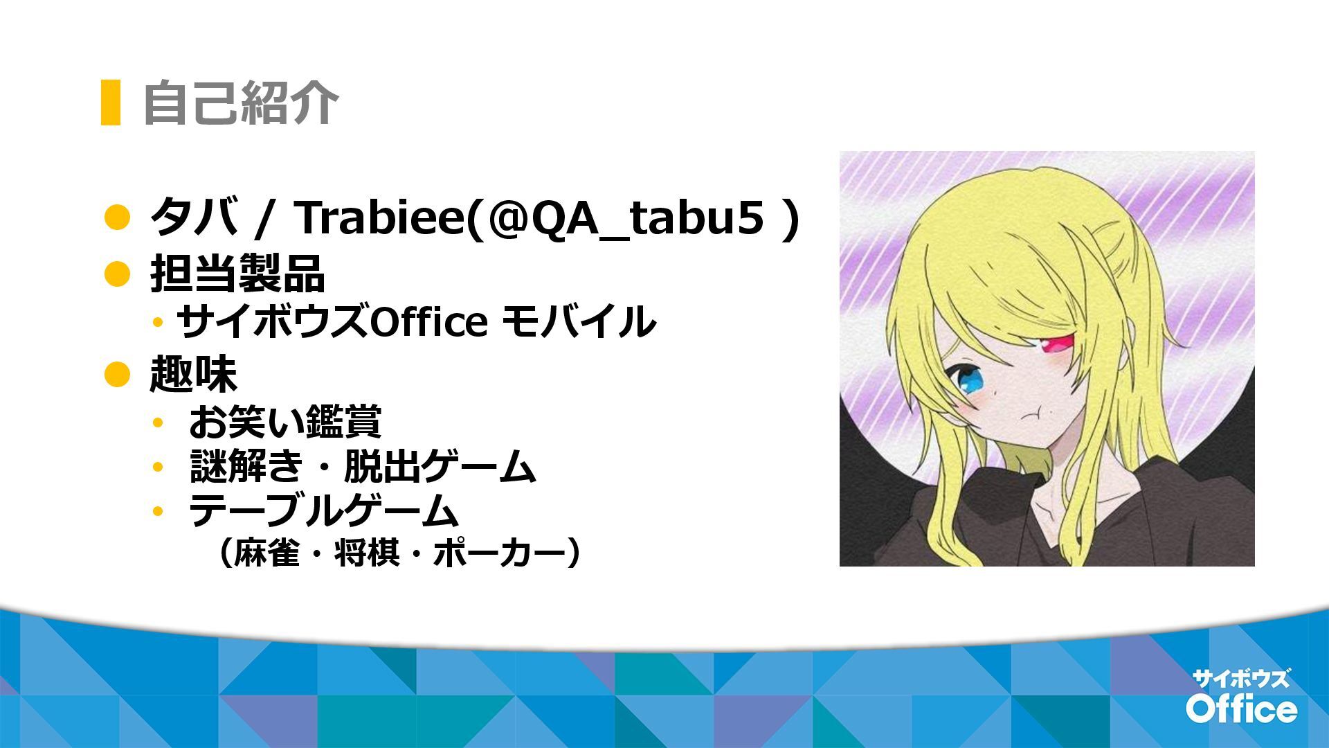 自己紹介 ⚫ タバ / Trabiee(@QA_tabu5 ) ⚫ 担当製品 • サイボウズOffice