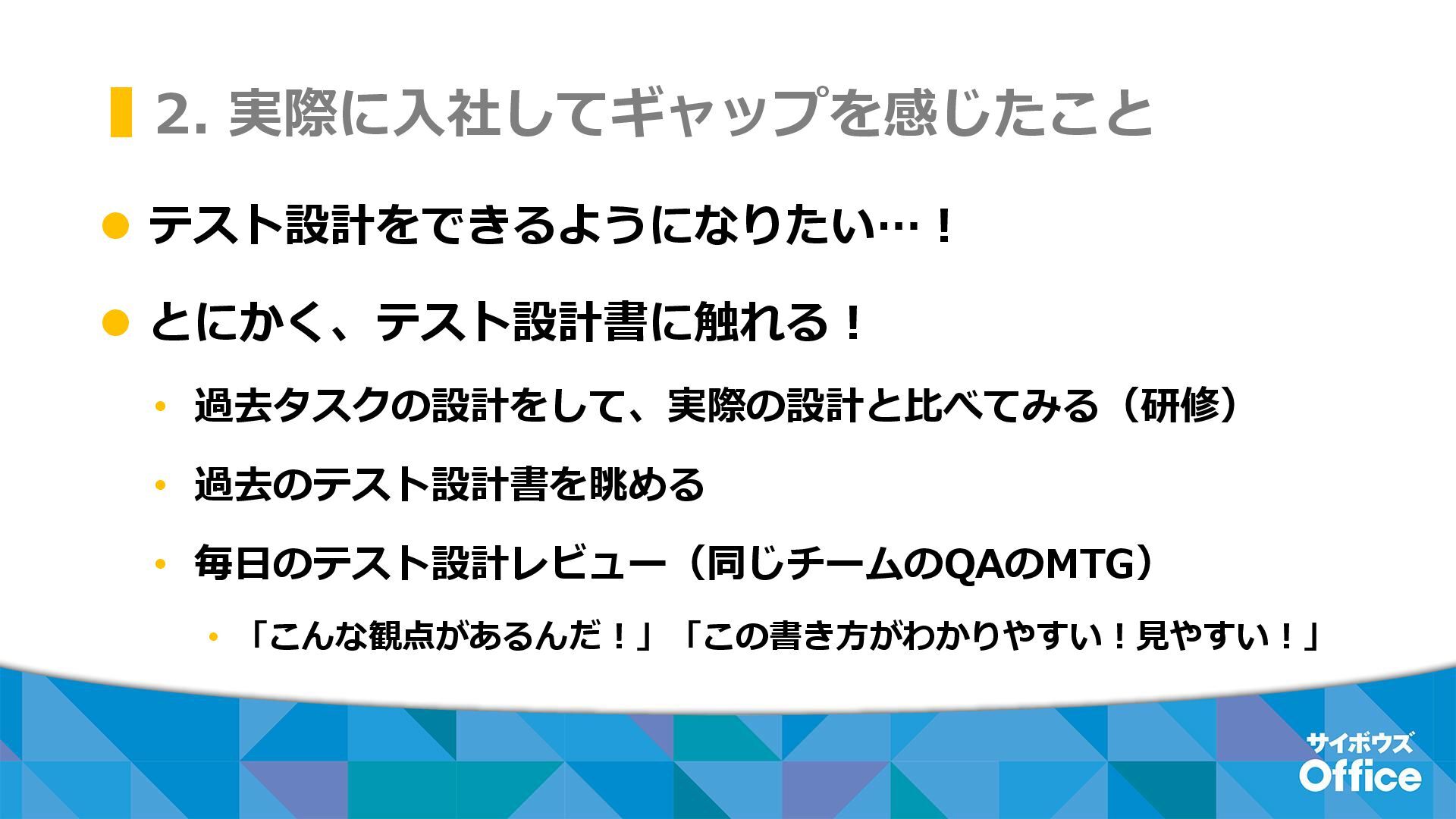 2. 実際に入社してギャップを感じたこと ⚫ テスト設計をできるようになりたい…! ⚫ とにかく、テスト設計書に触れる! • 過去タスクの設計をして、実際の設計と比べてみる(研修) • 過去のテスト設計書を眺める