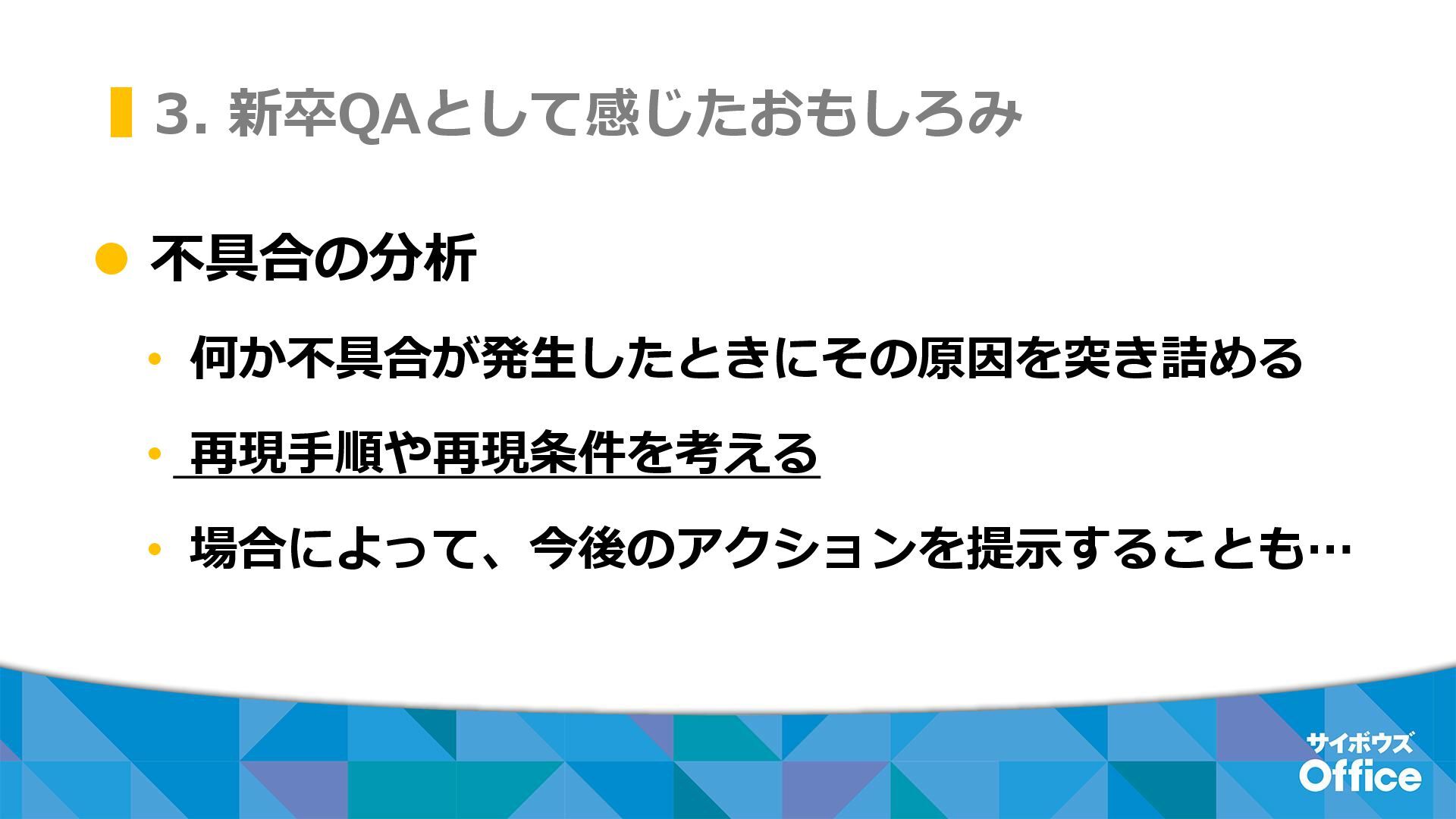 3. 新卒QAとして感じたおもしろみ ⚫ 不具合の分析 • 何か不具合が発生したときにその原因を突き詰める • 再現手順や再現条件を考える • 場合によって、今後のアクションを提示することも…