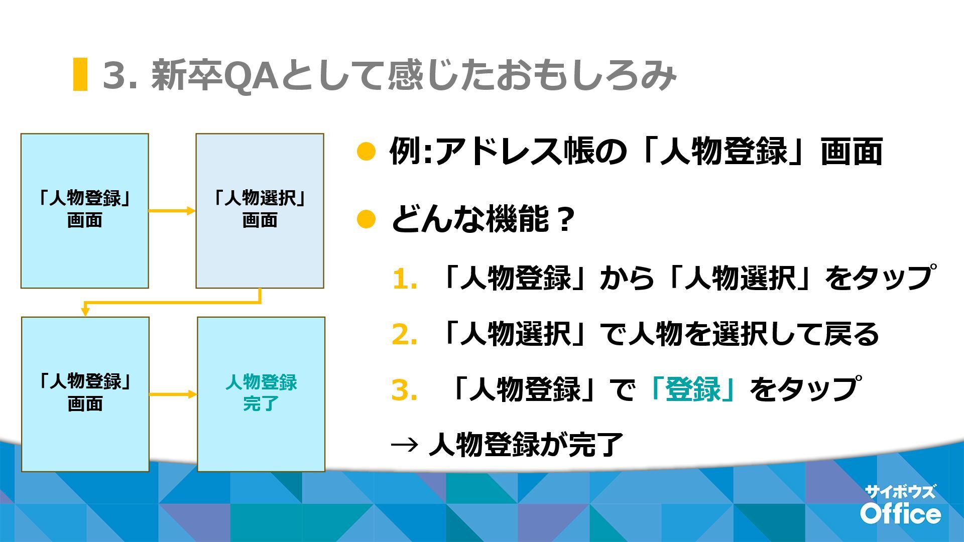 3. 新卒QAとして感じたおもしろみ ⚫ 例:アドレス帳の「人物登録」画面 ⚫ どんな機能? 1. 「人物登録」から「人物選択」をタップ 2. 「人物選択」で人物を選択して戻る