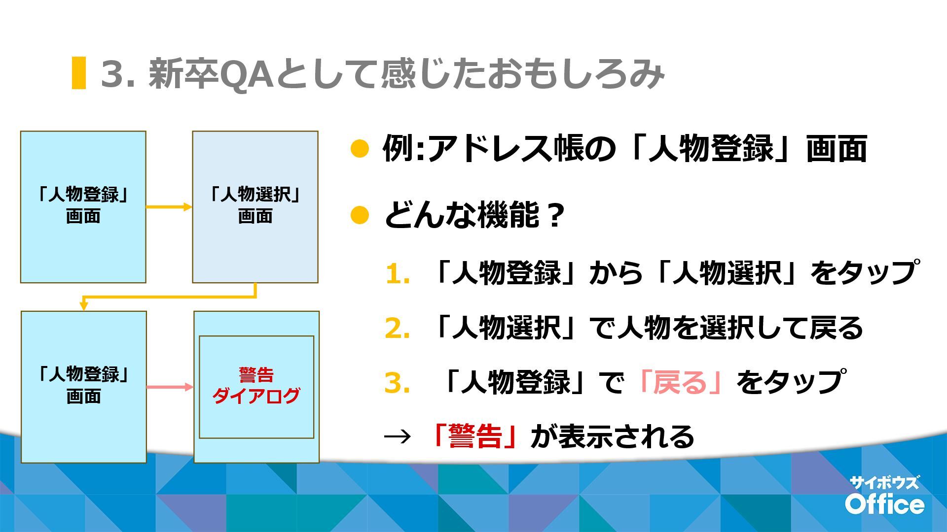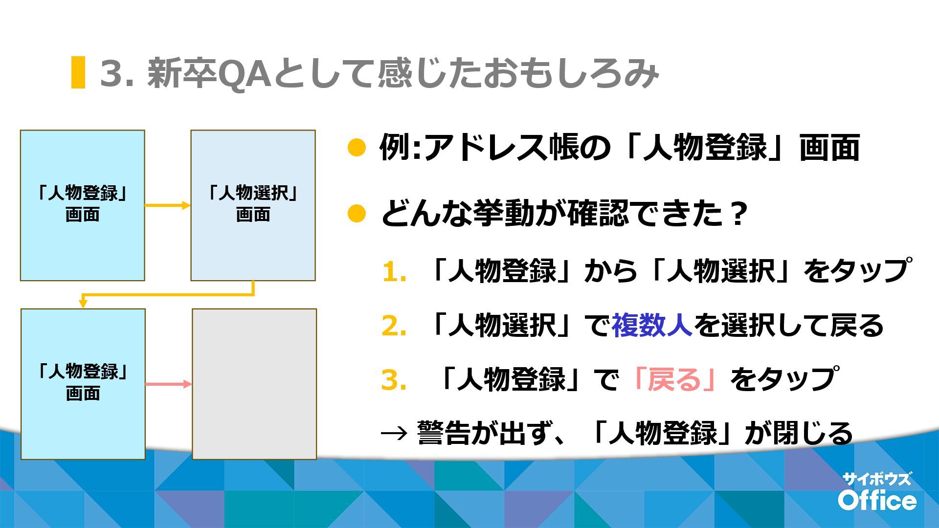 3. 新卒QAとして感じたおもしろみ ⚫ 例:アドレス帳の「人物登録」画面 ⚫ どんな挙動が確認できた? 1. 「人物登録」から「人物選択」をタップ 2. 「人物選択」で複数人を選択して戻る