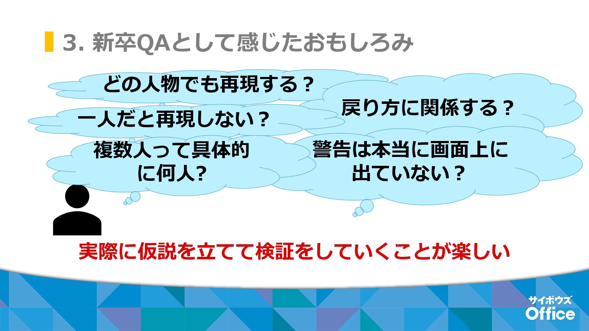 どの人物でも再現する? 戻り方に関係する? 3. 新卒QAとして感じたおもしろみ 実際に仮説を立てて検証をしていくことが楽しい 一人だと再現しない? 警告は本当に画面上に 出ていない? 複数人って具体的 に何人?