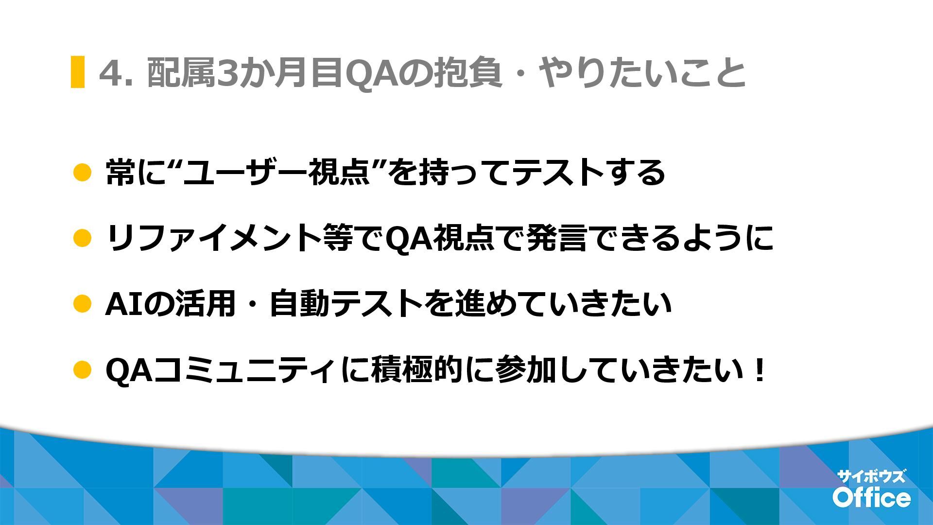 4. 配属3か月目QAの抱負・やりたいこと ⚫ 常に“ユーザー視点”を持ってテストする ⚫ リファイメント等でQA視点で発言できるように ⚫ AIの活用・自動テストを進めていきたい ⚫ QAコミュニティに積極的に参加していきたい!