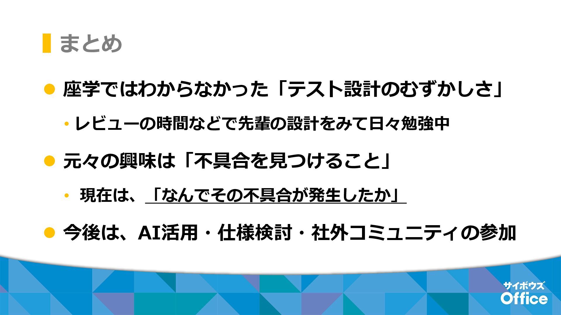 まとめ ⚫ 座学ではわからなかった「テスト設計のむずかしさ」 • レビューの時間などで先輩の設計をみて日々勉強中 ⚫ 元々の興味は「不具合を見つけること」 • 現在は、「なんでその不具合が発生したか」 ⚫