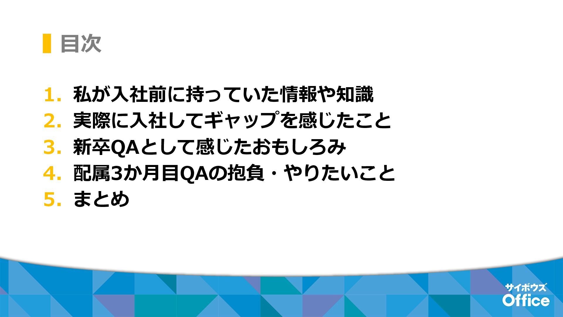 目次 1. 私が入社前に持っていた情報や知識 2. 実際に入社してギャップを感じたこと 3. 新卒QAとして感じたおもしろみ 4. 配属3か月目QAの抱負・やりたいこと 5.