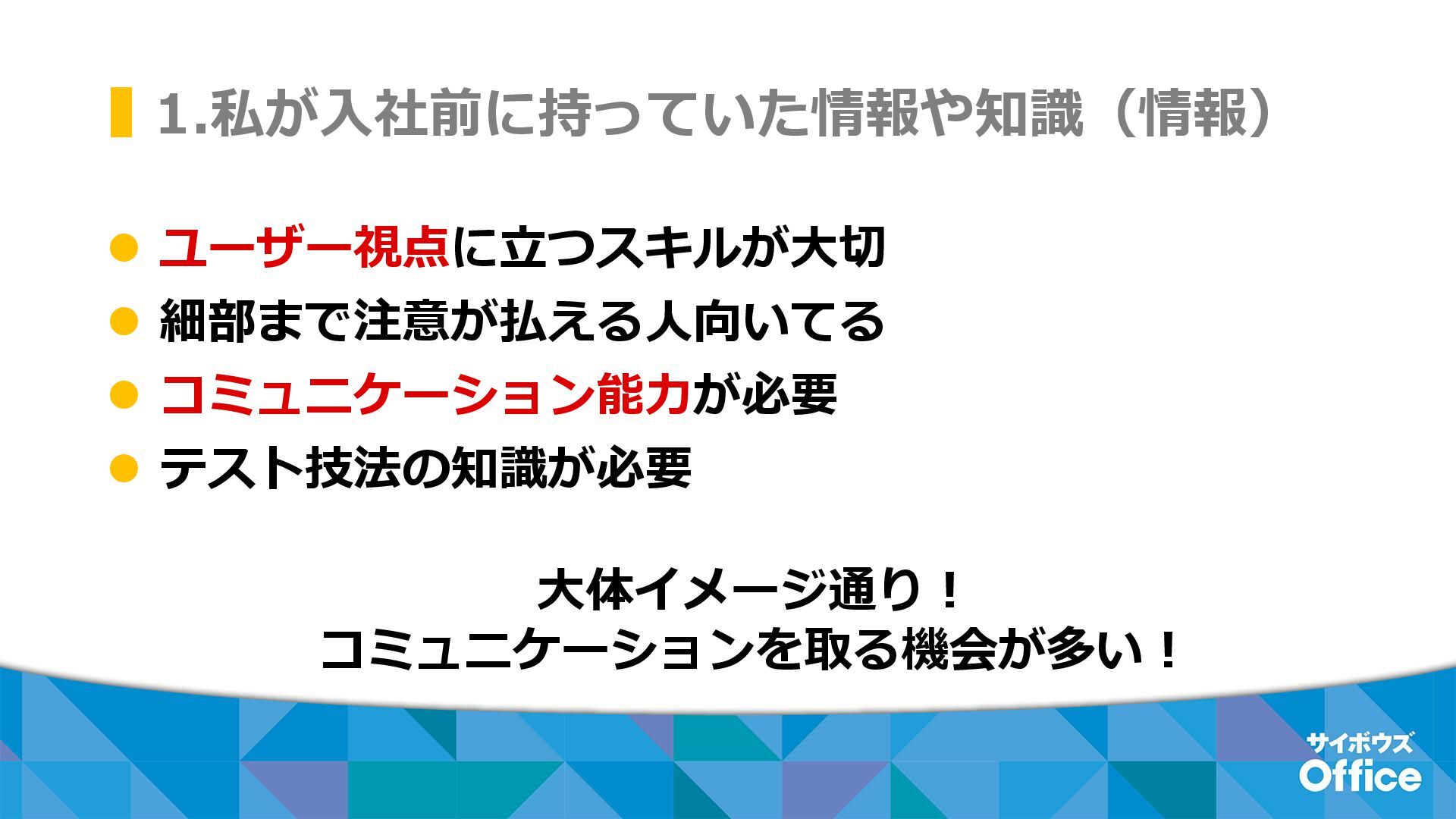 1.私が入社前に持っていた情報や知識(情報) ⚫ ユーザー視点に立つスキルが大切 ⚫ 細部まで注意が払える人向いてる ⚫ コミュニケーション能力が必要 ⚫ テスト技法の知識が必要 大体イメージ通り!