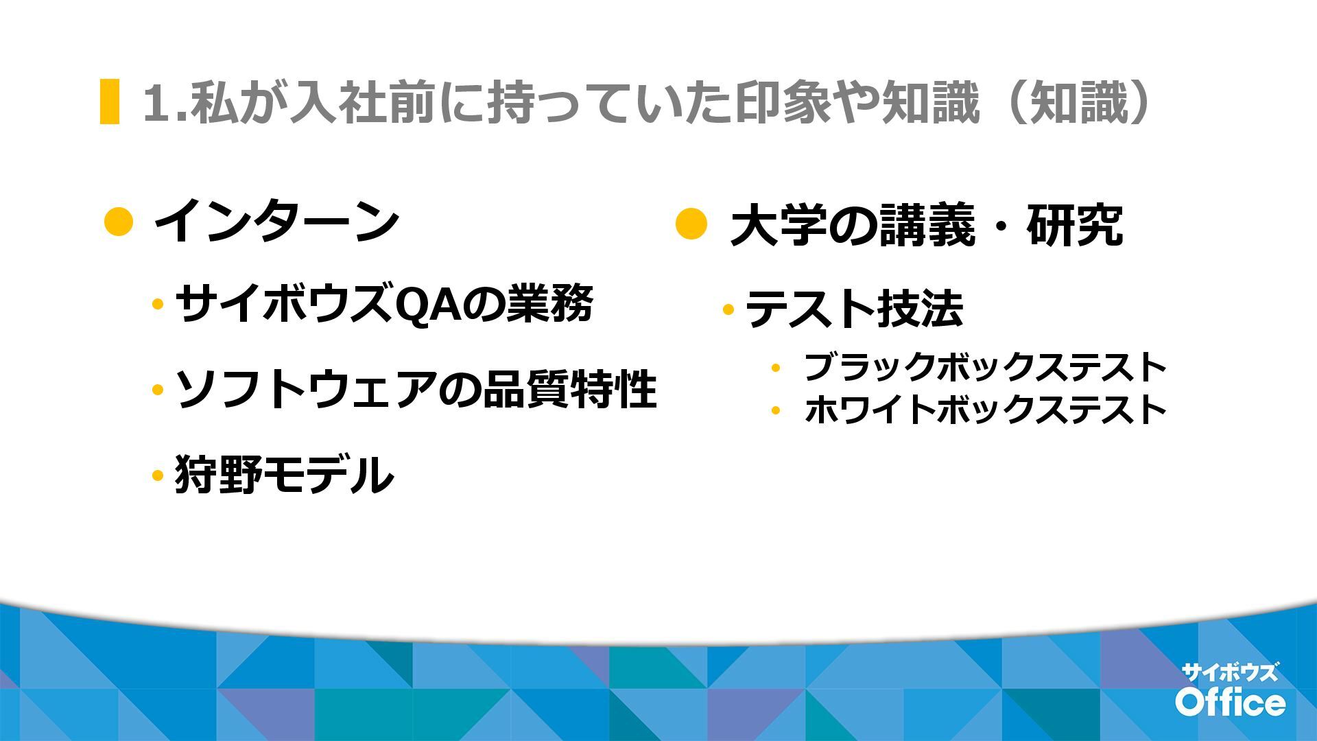 1.私が入社前に持っていた印象や知識(知識) ⚫ インターン • サイボウズQAの業務 • ソフトウェアの品質特性 • 狩野モデル ⚫