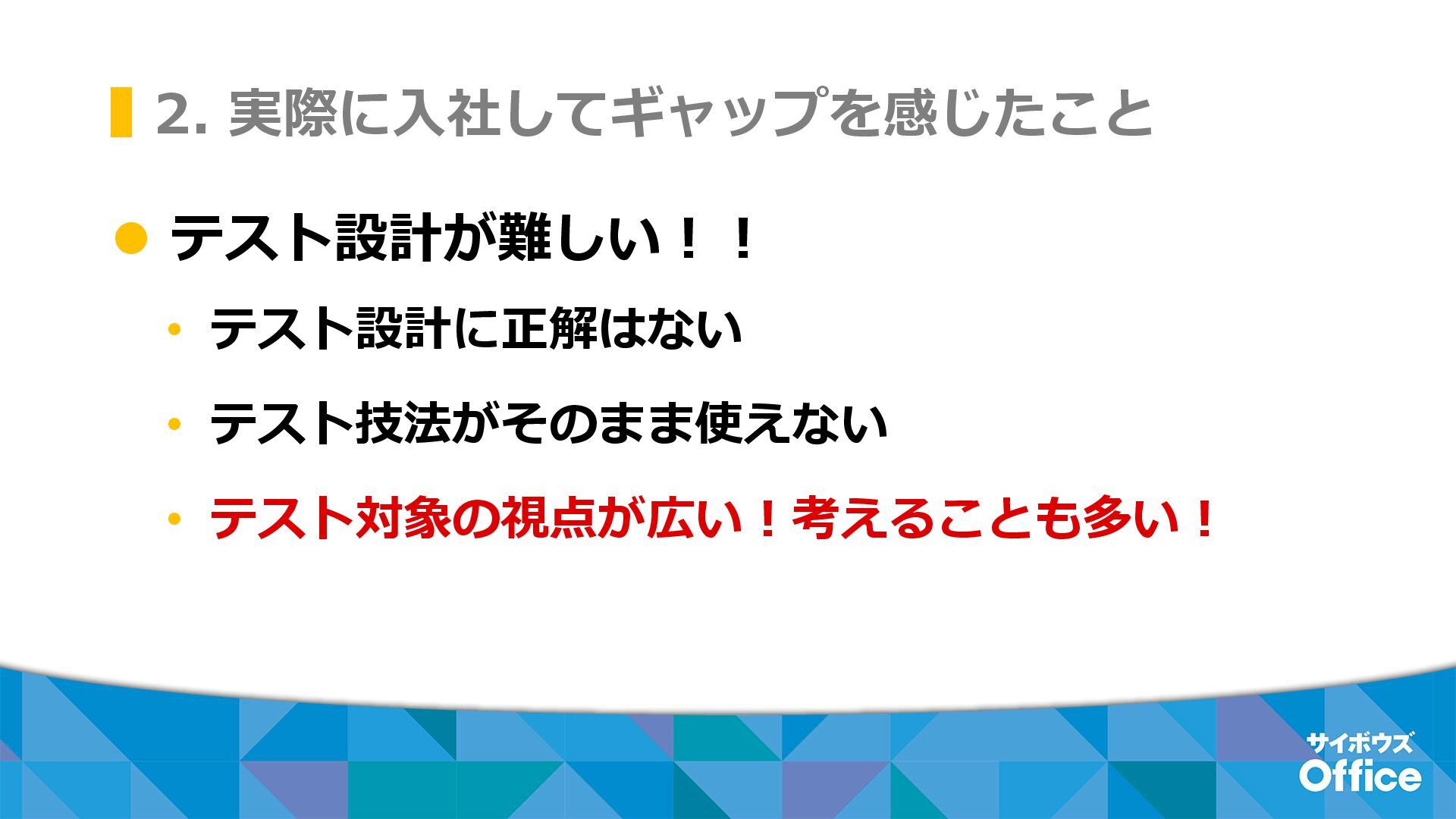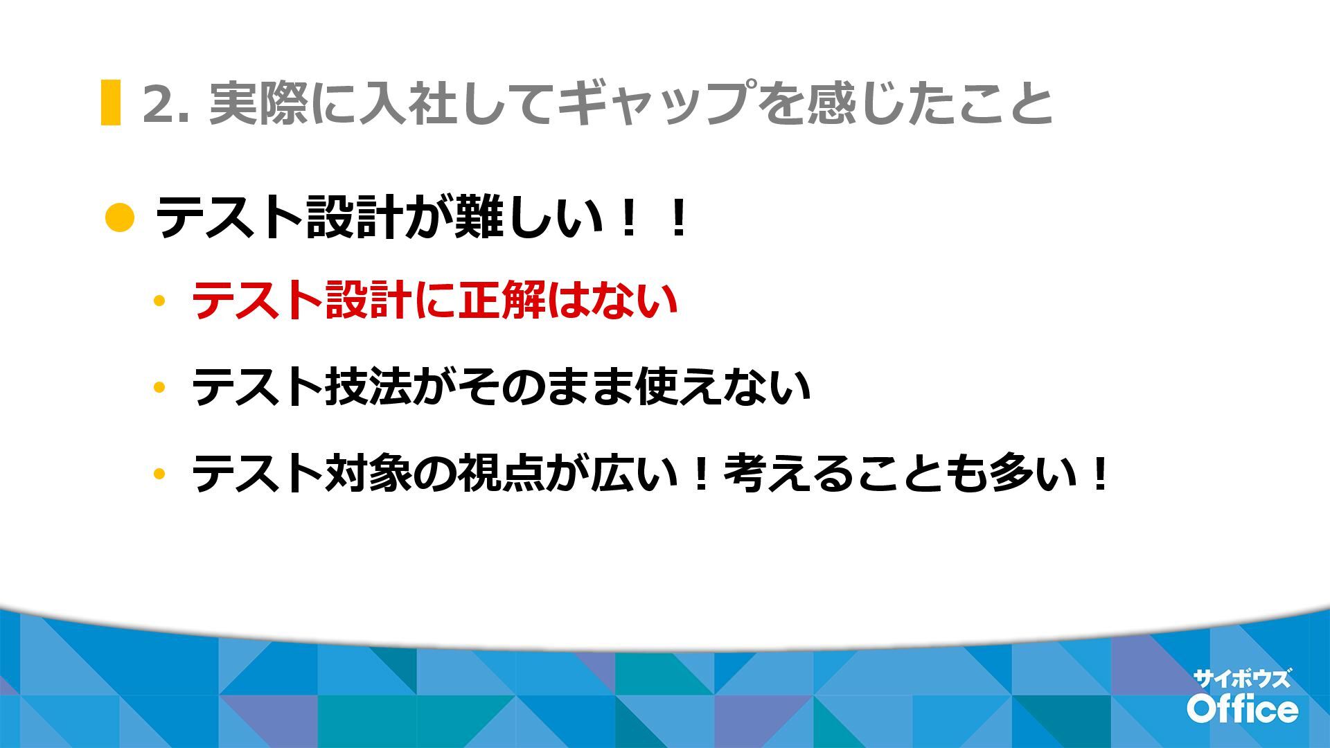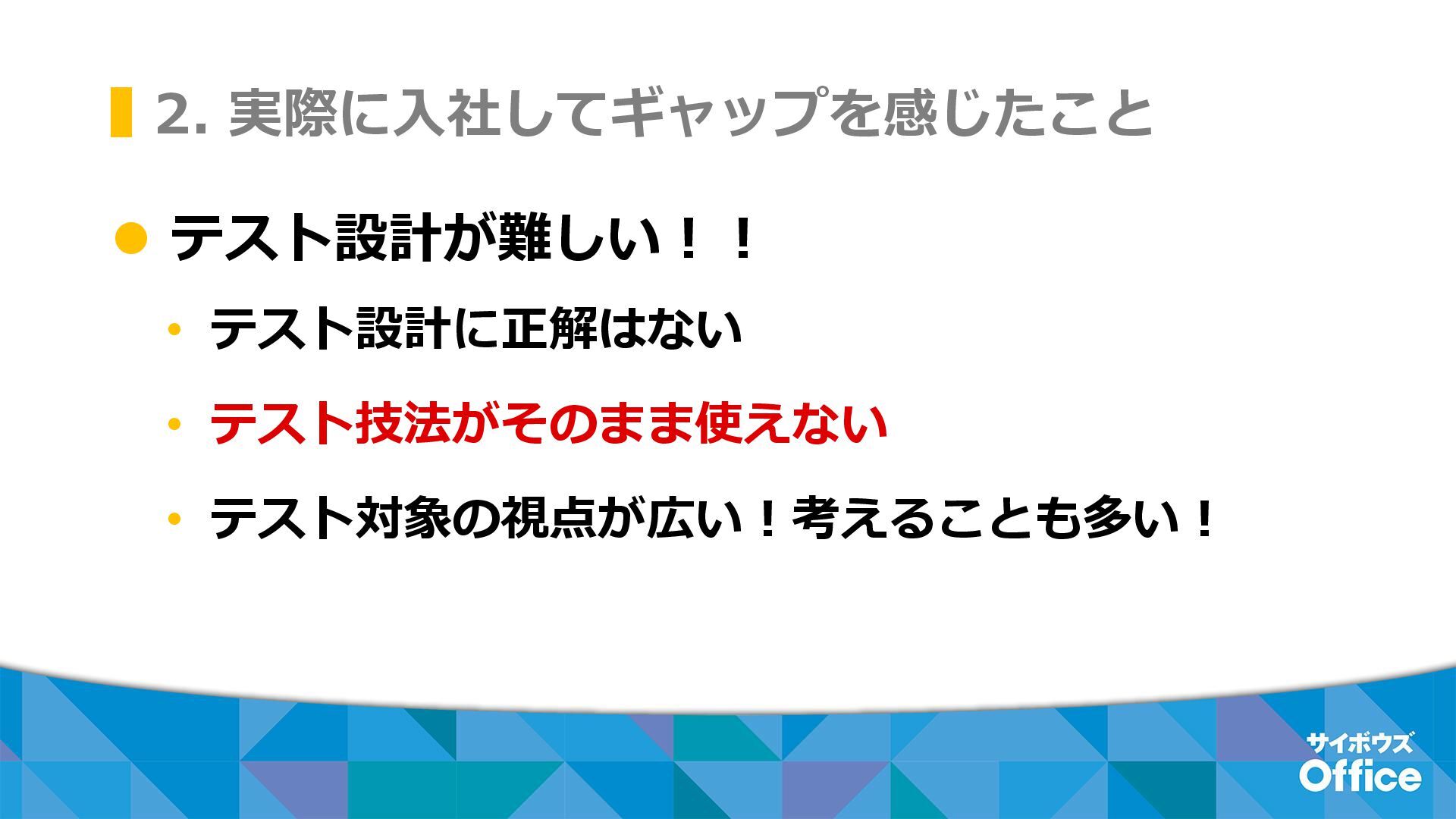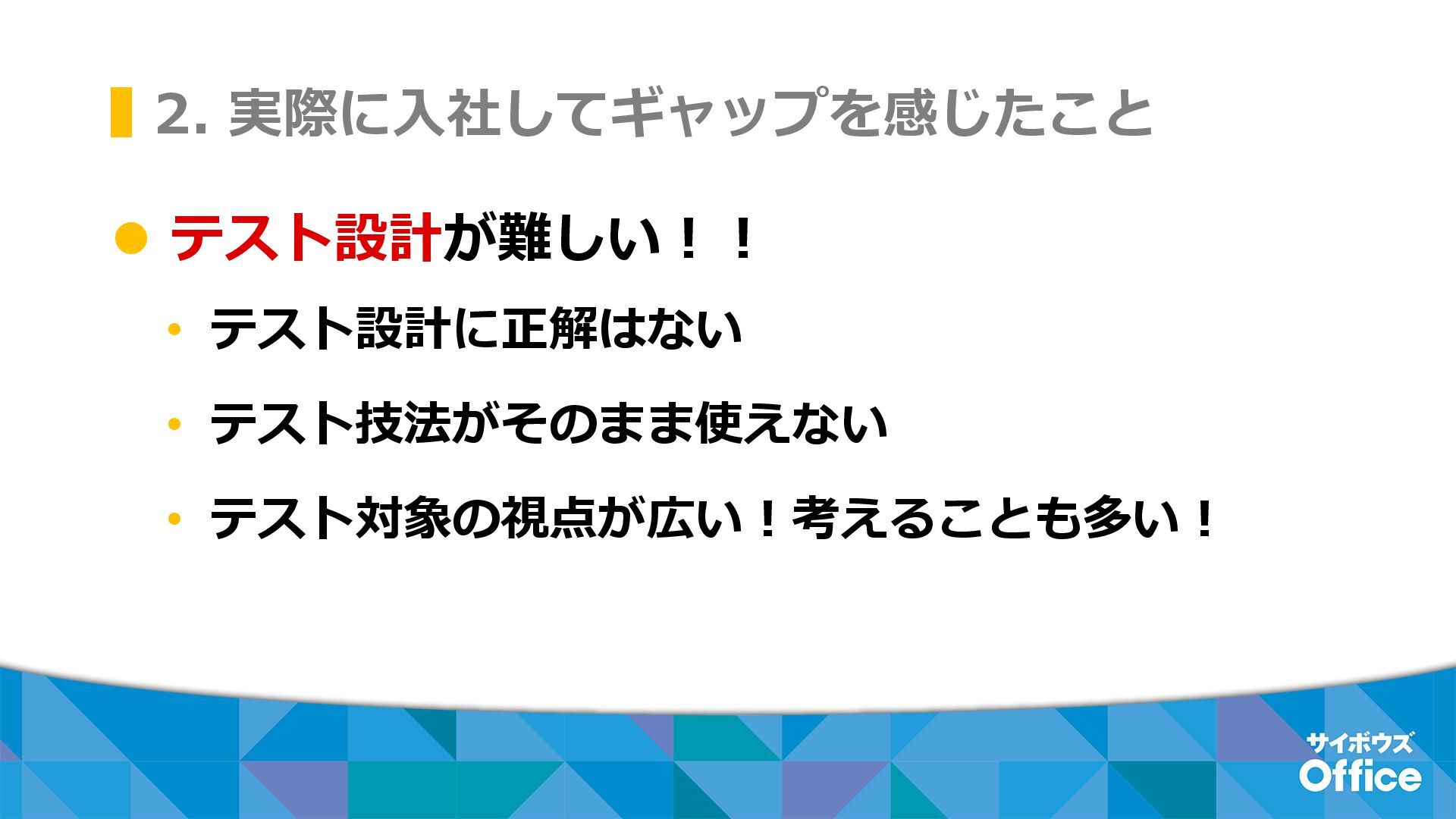 2. 実際に入社してギャップを感じたこと ⚫ テスト設計が難しい!! • テスト設計に正解はない • テスト技法がそのまま使えない • テスト対象の視点が広い!考えることも多い!