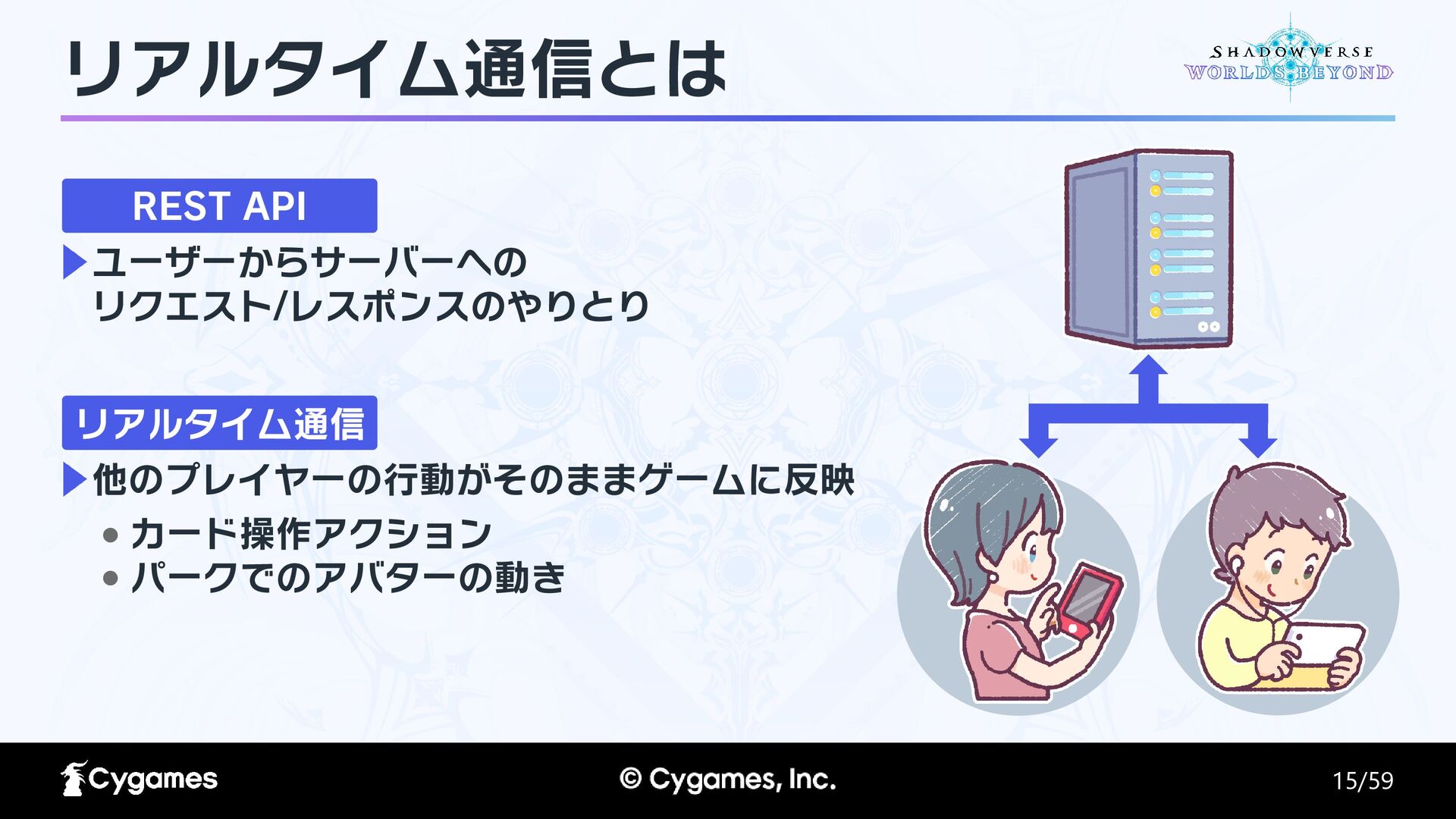 15/59 リアルタイム通信とは REST API ユーザーからサーバーへの リクエスト/レスポンスのやりとり リアルタイム通信 他のプレイヤーの行動がそのままゲームに反映 カード操作アクション パークでのアバターの動き