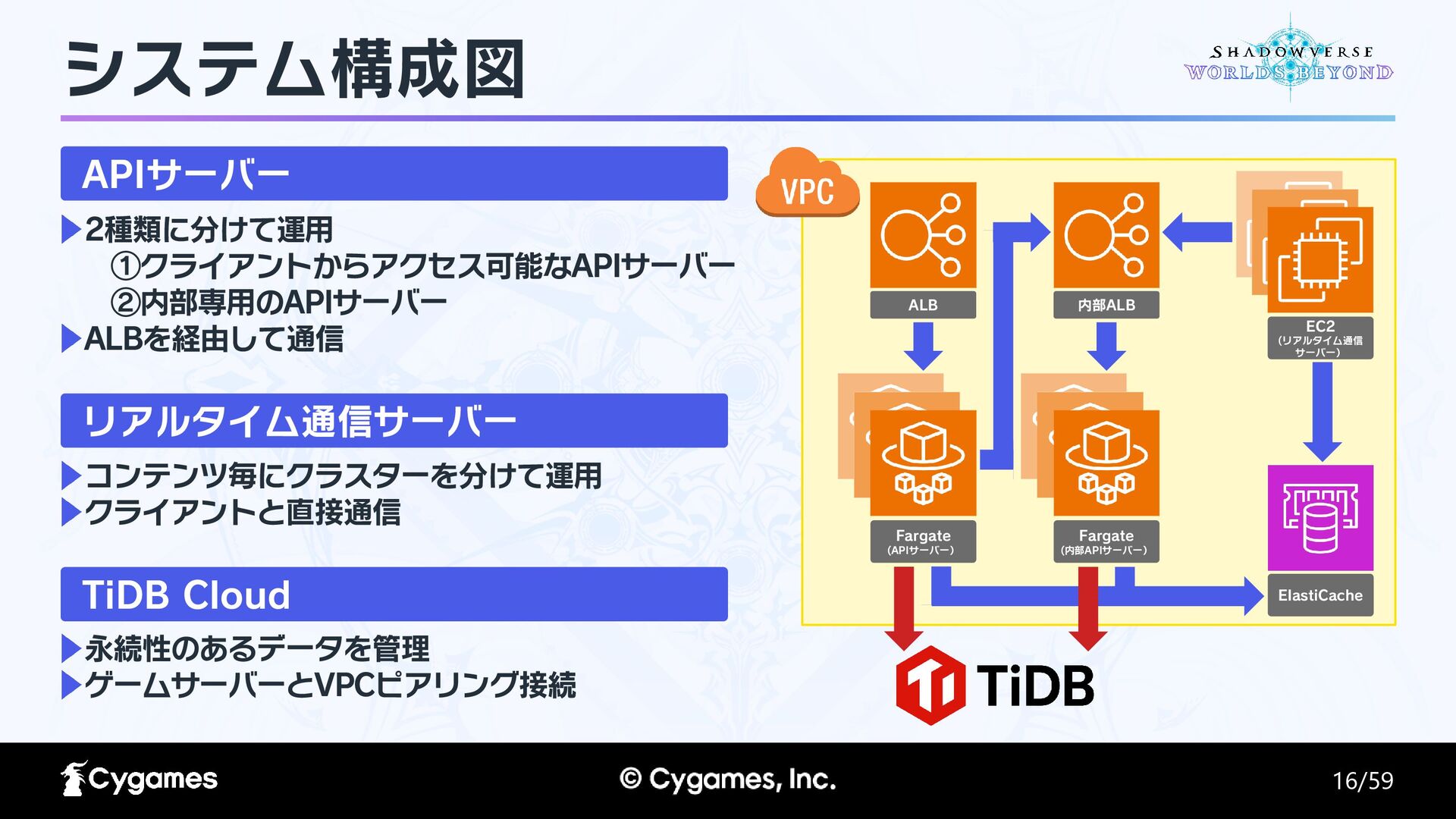 ①クライアントからアクセス可能なAPIサーバー ②内部専用のAPIサーバー ALBを経由して通信 リアルタイム通信サーバー コンテンツ毎にクラスターを分けて運用 クライアントと直接通信 TiDB Cloud 永続性のあるデータを管理 ゲームサーバーとVPCピアリング接続 ElastiCache EC2 (リアルタイム通信 サーバー)