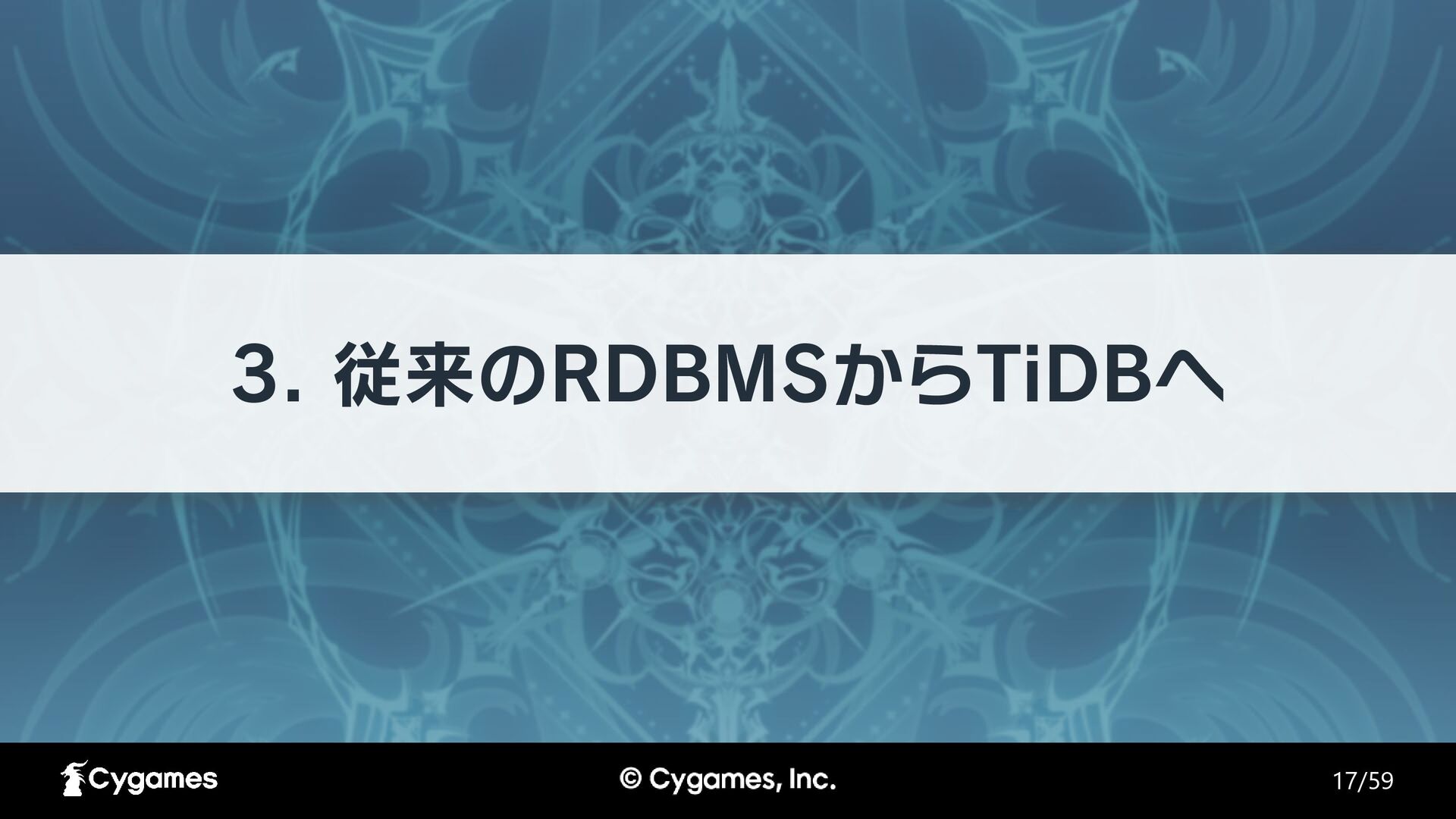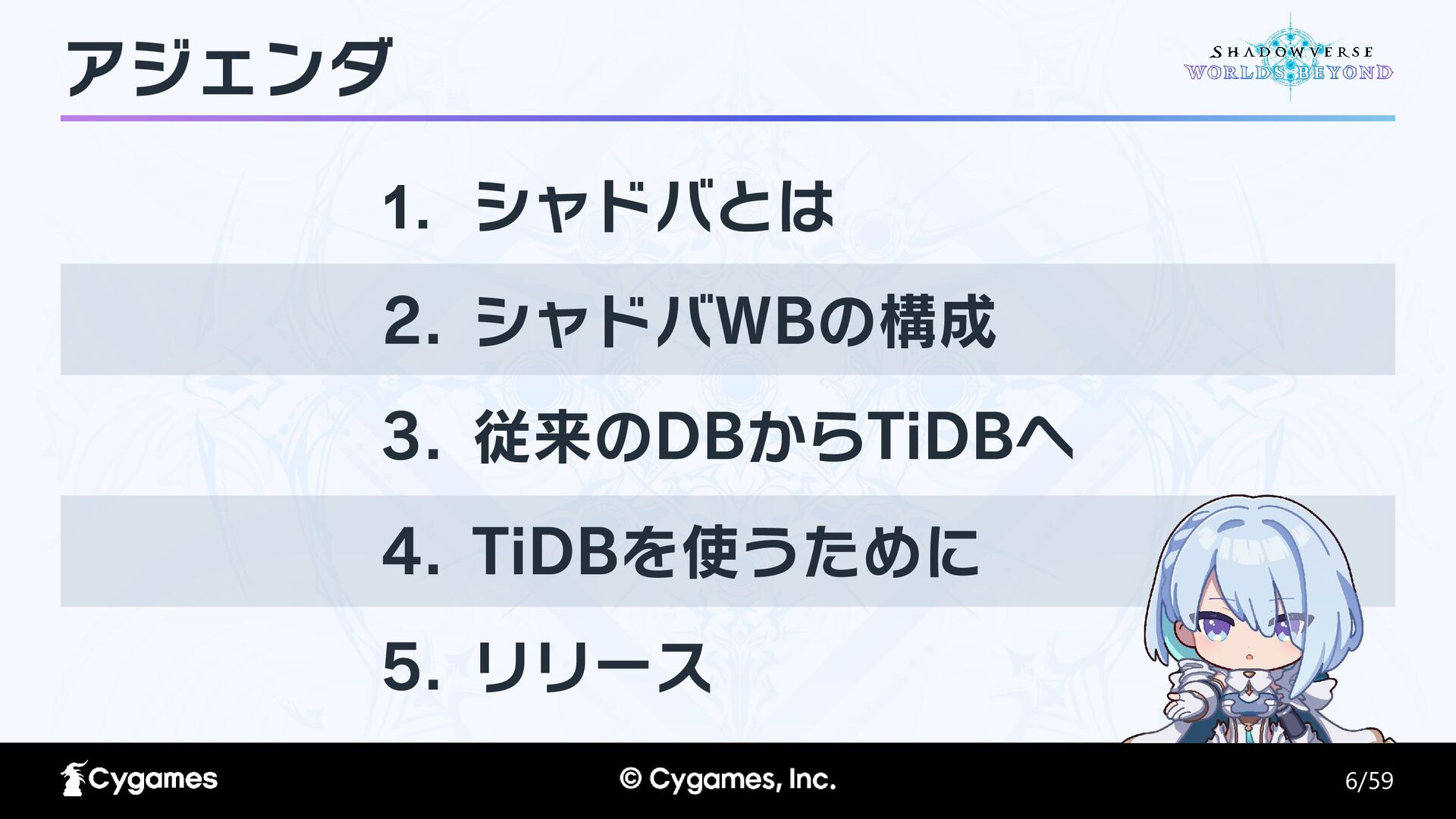 6/59 1. シャドバとは 2. シャドバWBの構成 3. 従来のDBからTiDBへ 4. TiDBを使うために 5.